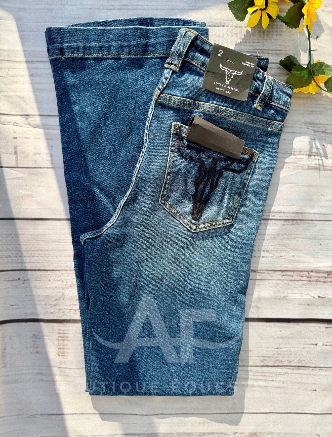 Saddle up in timeless western flair with these Dark Wash Bootcut Jeans featuring Lucky & Blessed’s signature embroidered steer head on the back pockets. These jeans blend classic rodeo styling with modern comfort — crafted from soft stretch denim that hugs your curves while offering freedom of movement. The mid-to-high rise waist provides secure coverage, while the detailed back pockets add a bold western statement. Designed to fit effortlessly over boots, these jeans are ideal for ranch work, western events, or everyday cowgirl fashion. A must-have denim piece for retailers catering to confident, fashion-forward women in the western lifestyle market. High Rise Tummy Control - Smooths and flatters for a sleek silhouette Reinforced Belt Loops - Designed for durability and everyday wear Butt Shaping - Enhances shape for a more flattering look Gap Control Waistband - Eliminates waistline gaps for a secure fit. Inseam: 33 in nfr western rodeo