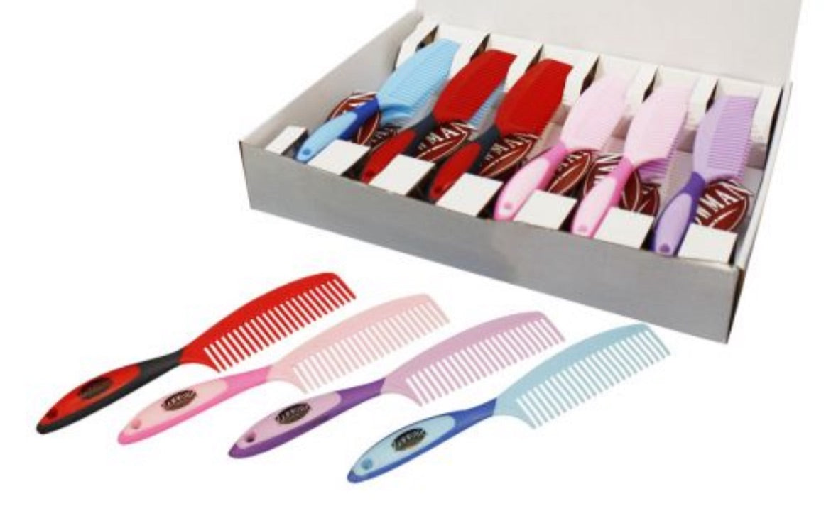 Soft touch handle mane and tail comb. This comb is made of durable molded plastic with a soft touch rubber grip handle. Measures 9 1/2" long with a 4 1/2" handle. Comb head is 1 1/2" wide.