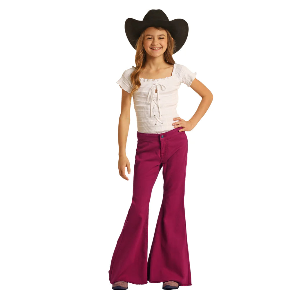 - Burgundy red bell bottom jeans.