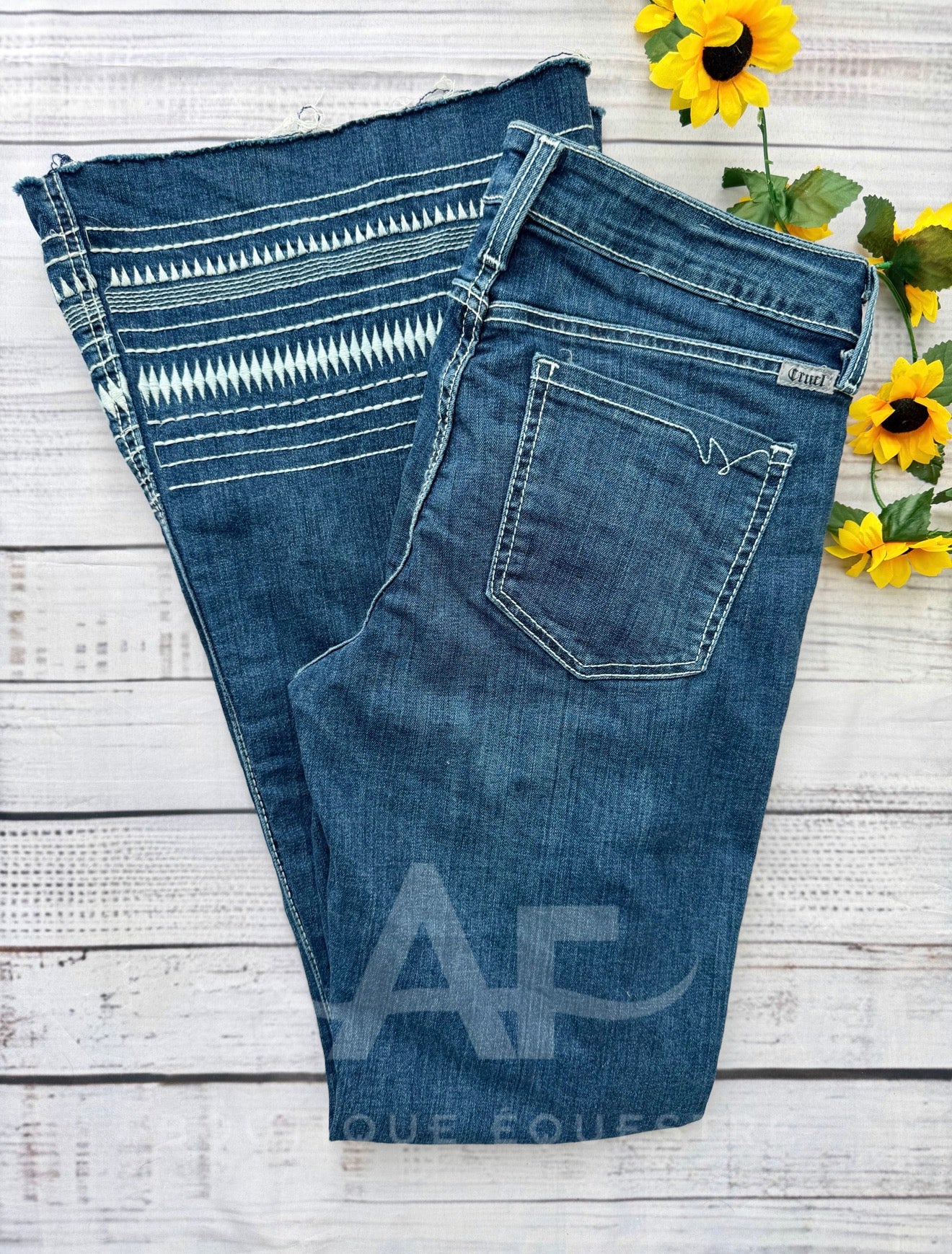 - White embroidery detail on flare legs.