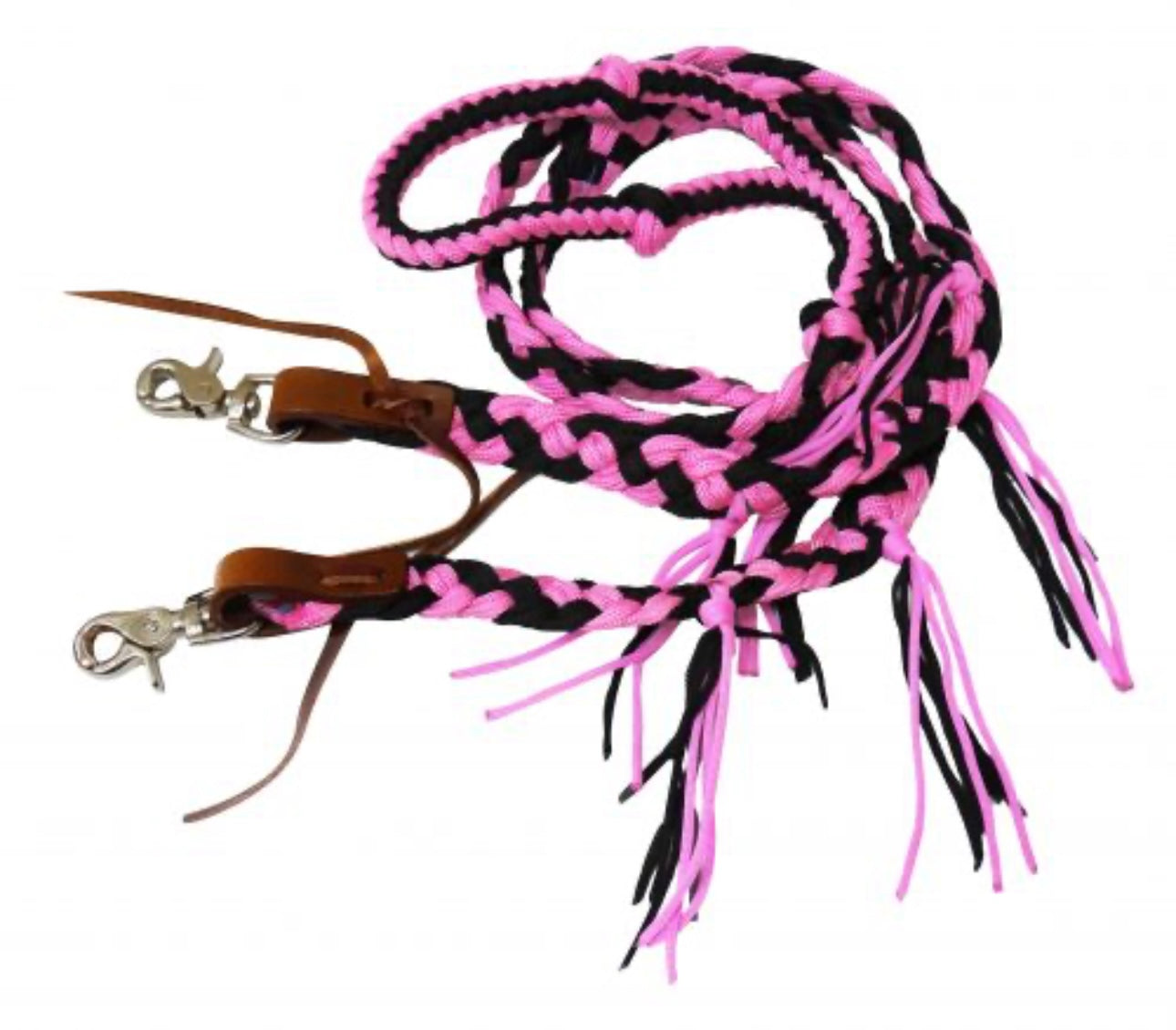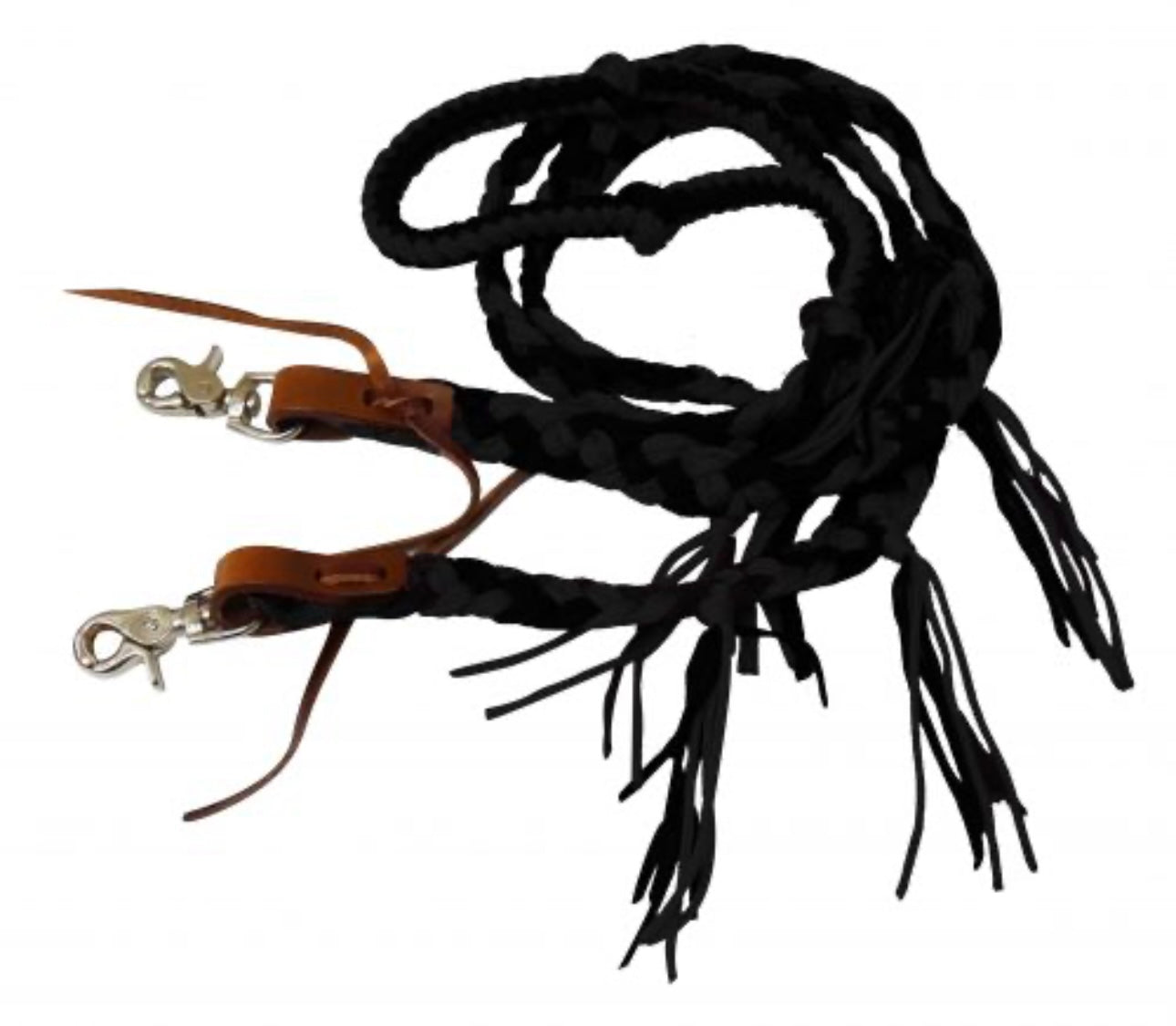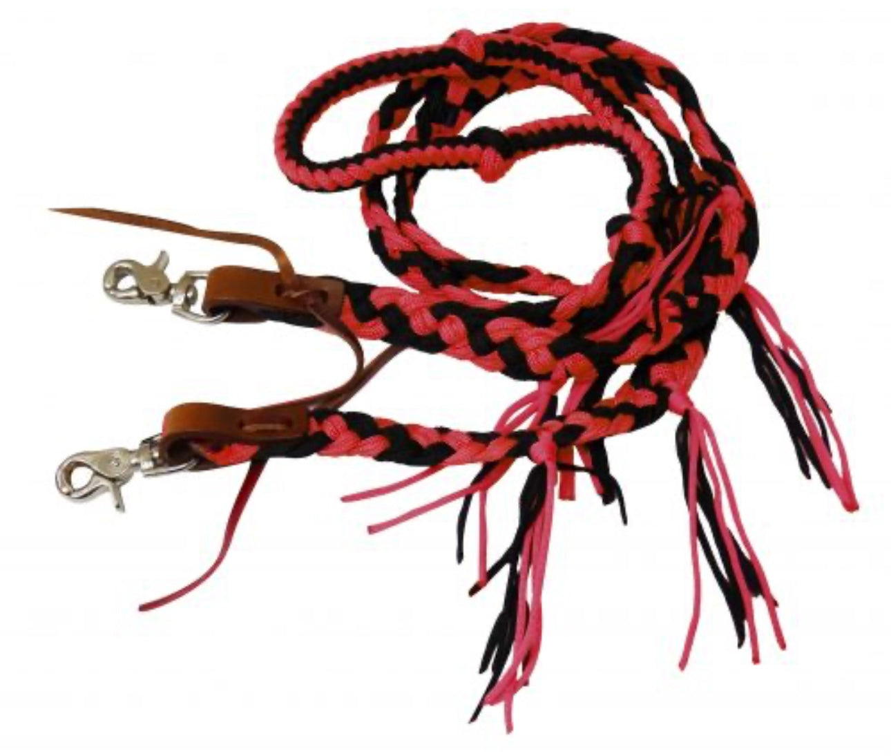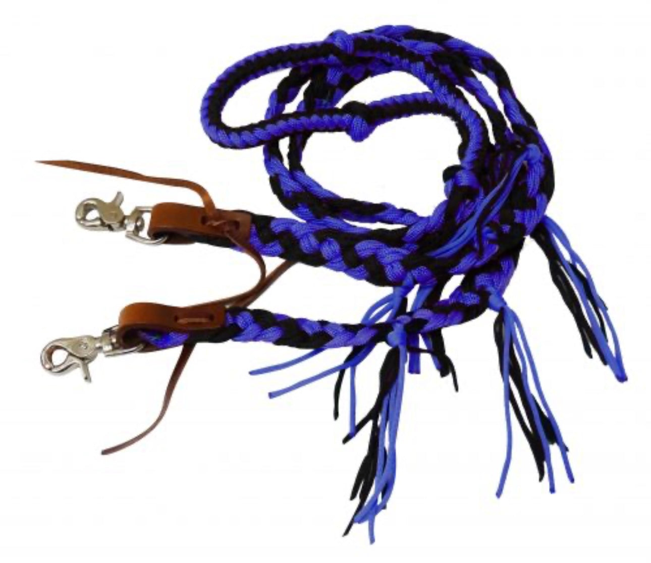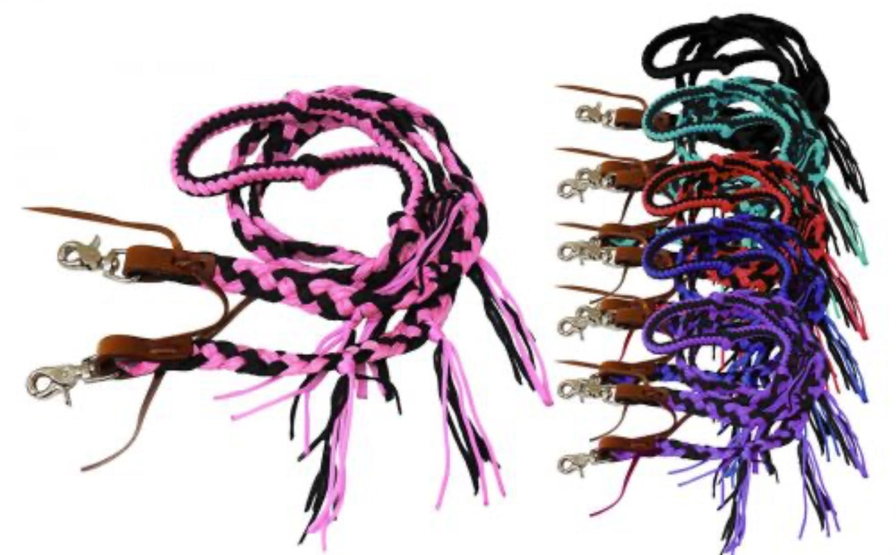 8 ft braided nylon reins with tassels. These reins feature easy grip knots on a round braided center and a flat end with nylon tassels. Easily attach with scissor snap ends.