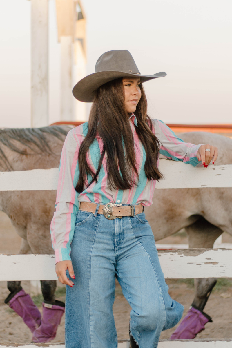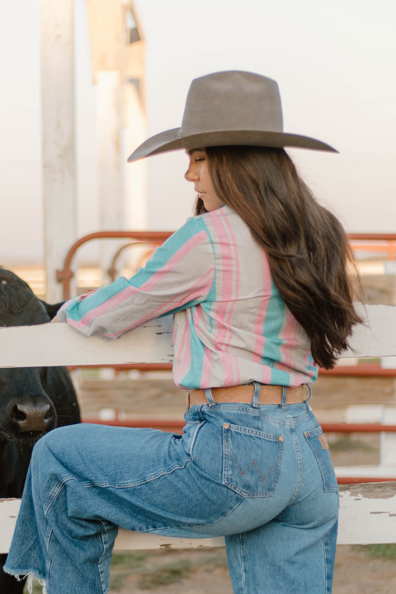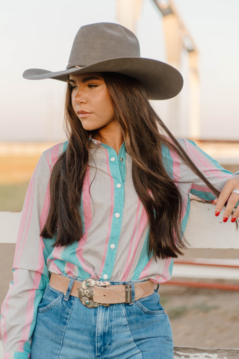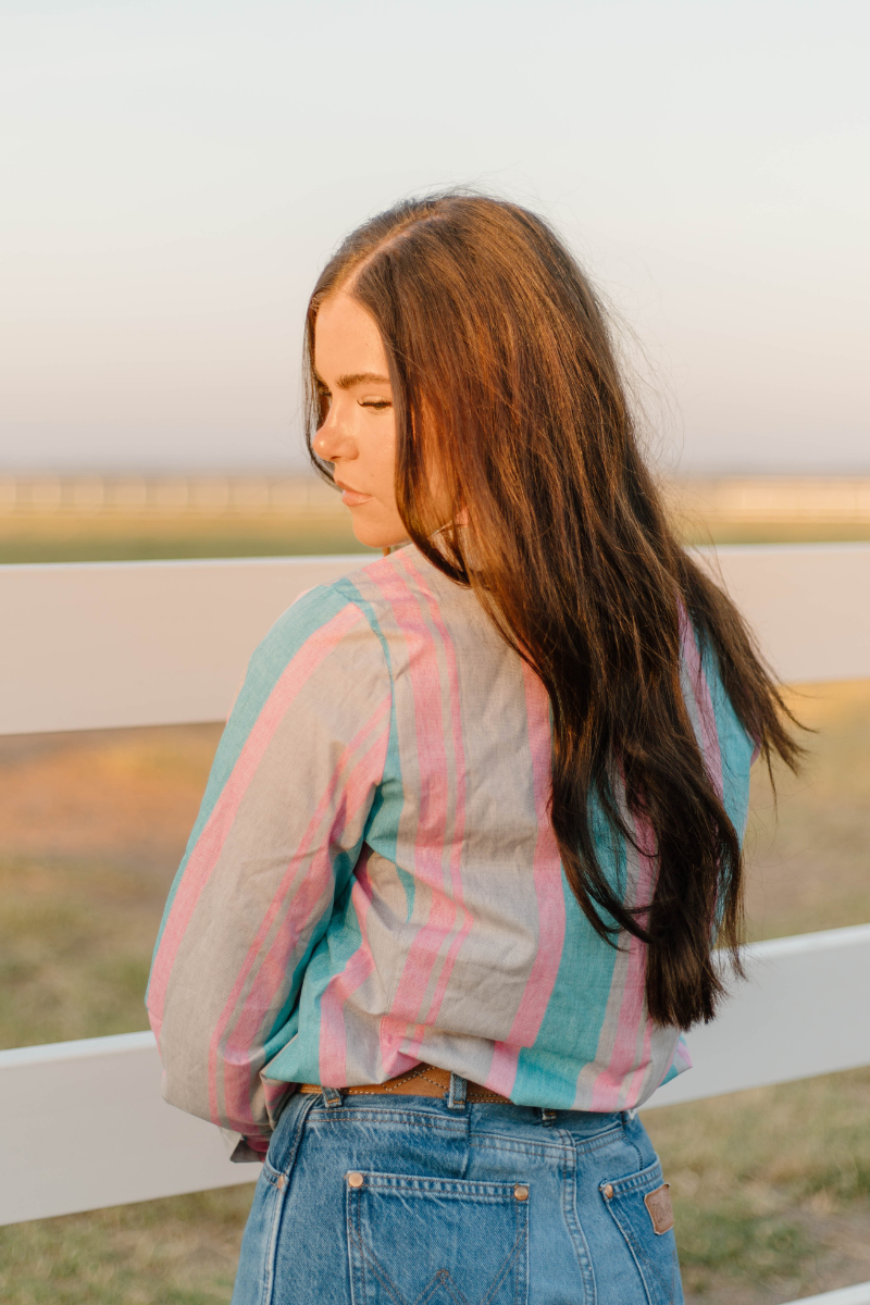 Add a vibrant twist to your wardrobe with this button-up shirt featuring eye-catching pink, turquoise, and tan stripes. Designed with classic pearl snap buttons, it blends timeless style with a fresh, colorful flair. Perfect for making a confident statement, this shirt offers both comfort and standout style for any occasion.