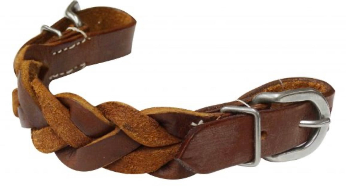 Braided leather curb strap with buckles. 1" wide braided leather with nickel plated buckles on both ends. Easily adjusts 10"-11".