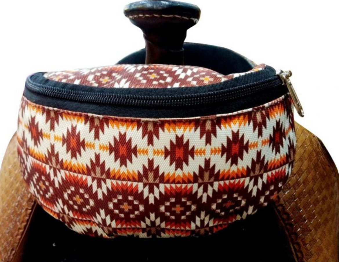Aztec Print Insulated Nylon Saddle Pouch. Includes two convenient pockets that are ideal for your phone, keys, money, snacks, etc. Simply clip the saddle pouch to the pommel of your saddle with two buckles. Measures 8.5" long by 3.5" wide by 4.5" tall
