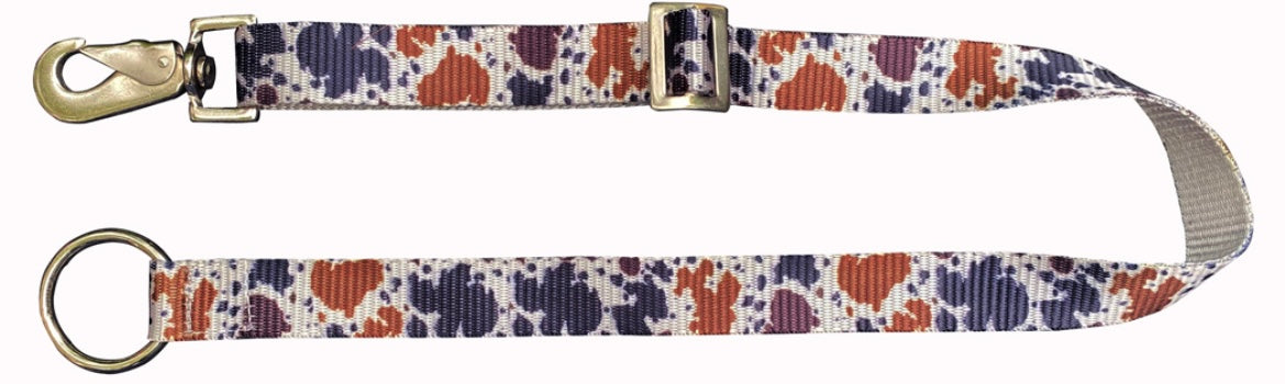 1" Cow Print nylon adjustable bucket hanger with snap and ring. Measures 30" long.