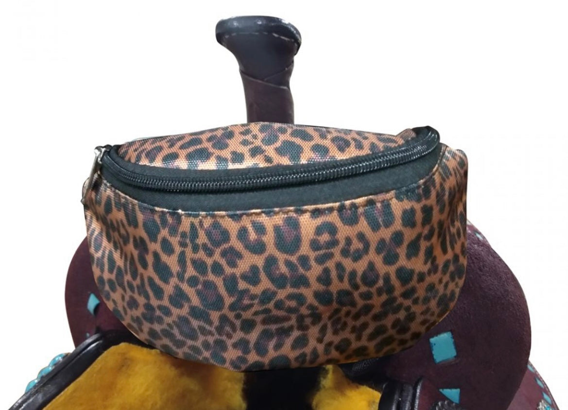 Cheetah Print Insulated Nylon Saddle Pouch. Includes two convenient pockets that are ideal for your phone, keys, money, snacks, etc. Simply clip the saddle pouch to the pommel of your saddle with two buckles. Measures 8.5" long by 3.5" wide by 4.5" tall.
