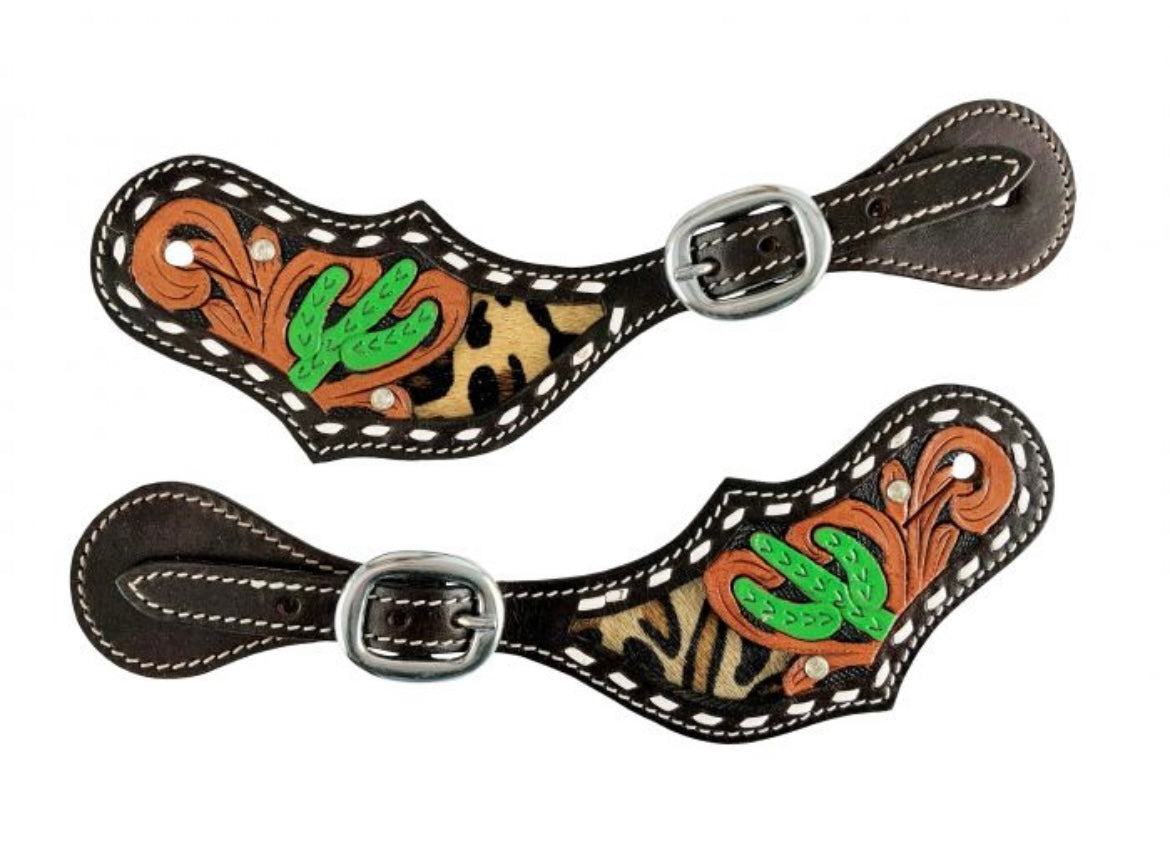 Ladies leather spur straps with Hair on Cheetah Print Inlay with Painted Cactus accent. These spur straps feature dark oil leather with a green painted cactus design.