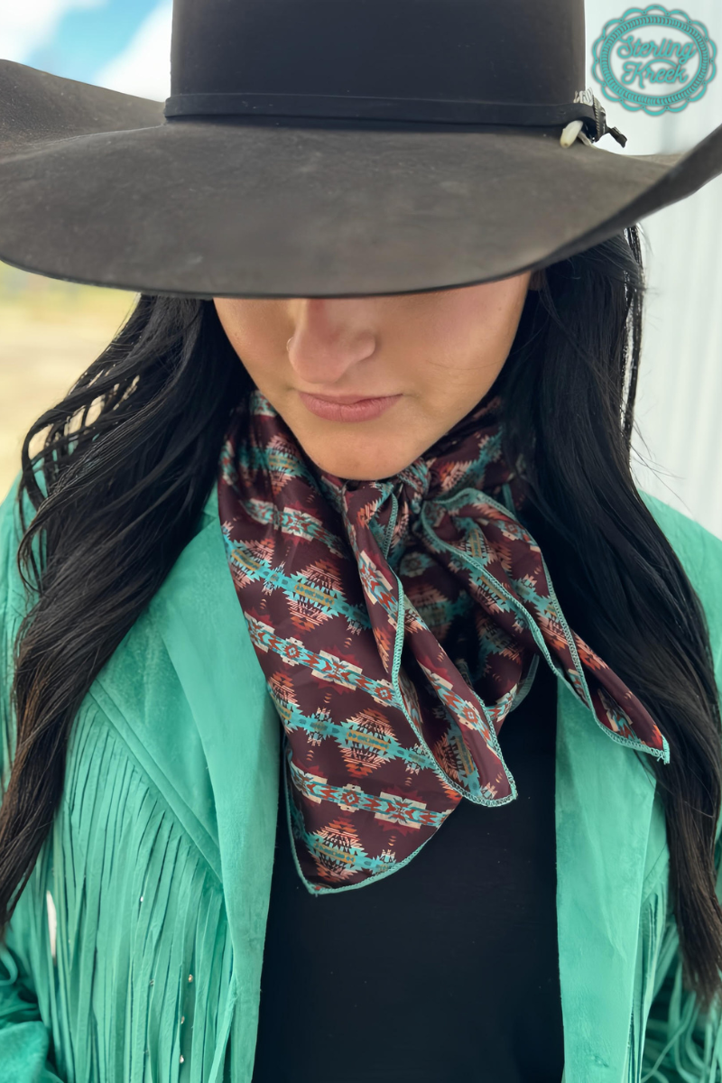 Introducing the Bermuda Bay Wildrag - featuring a playful Aztec print on a smooth brown fabric with vibrant turquoise trim. This versatile accessory adds a pop of color to any outfit and is perfect for spicing up your wardrobe. Stay stylish with the Bermuda Bay Wildrag!