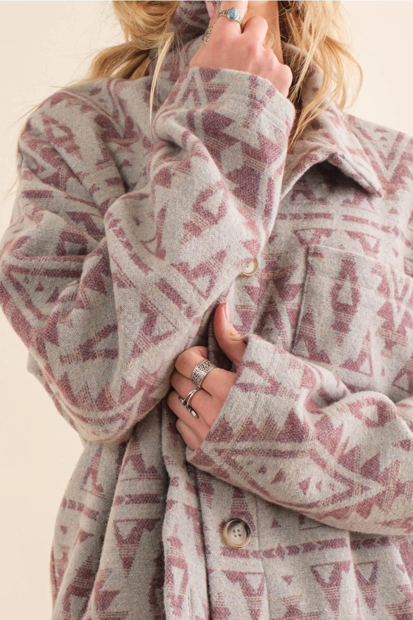 Jacquard Aztec Print Button Up Mock Neck Western Jacket
