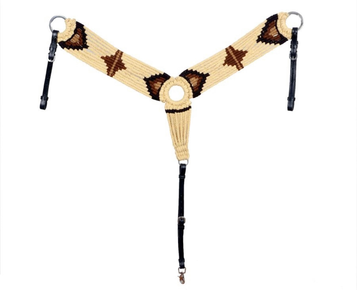 Multi Strand Southwest Design Breast collar. This Cream colored Multi-Strand Breast collar features a brown southwest woven design with dark leather tugs and SS hardware