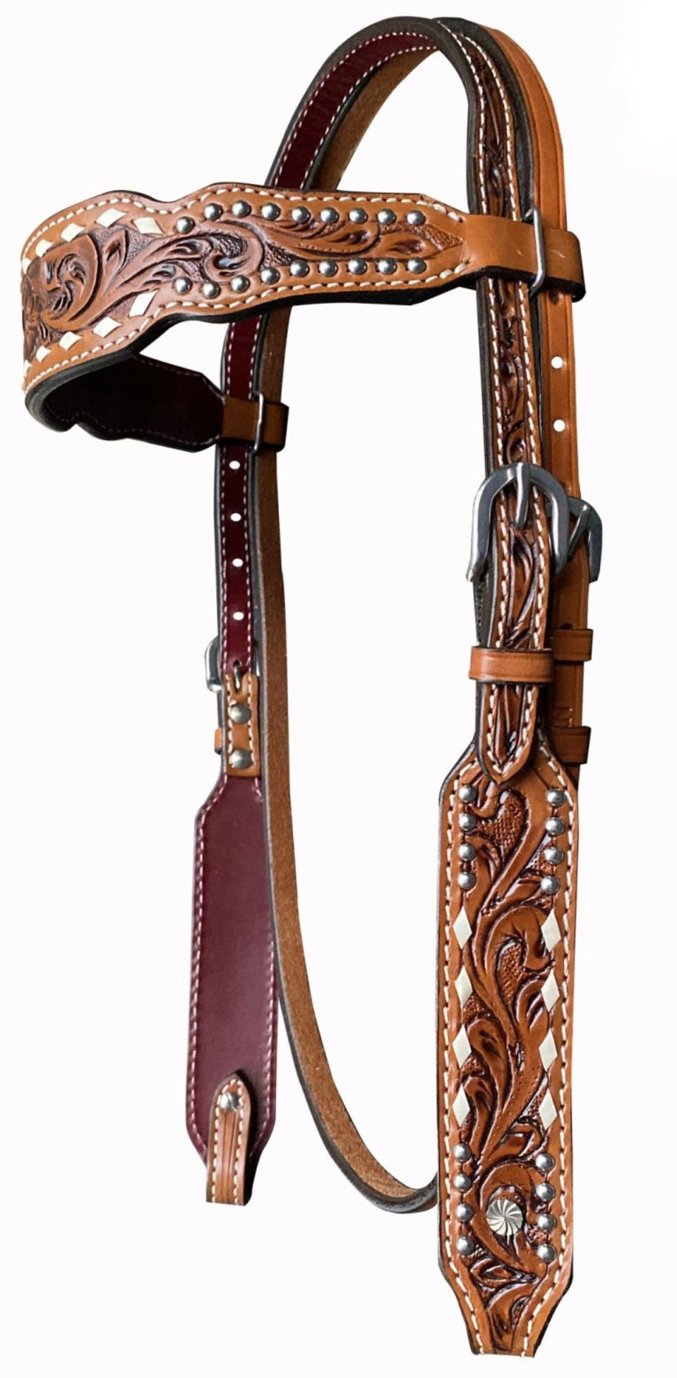 Floral Tooled Browband Leather Headstall. This headstall features medium colored leather with floral tooling and rawhide lacing and bead accents. Does NOT come with reins.