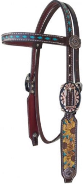 Argentina cow leather brow band headstall with hand painted sunflowers. This headstall features dark brown colored Argentina cow leather with turquoise buck stitch on brow band and crown, hand painted cut out sunflower overlay, and turquoise painted inlay on cheeks. Headstall has black buckles with antiqued sunflowers and conchos are accented with antiqued flowers.