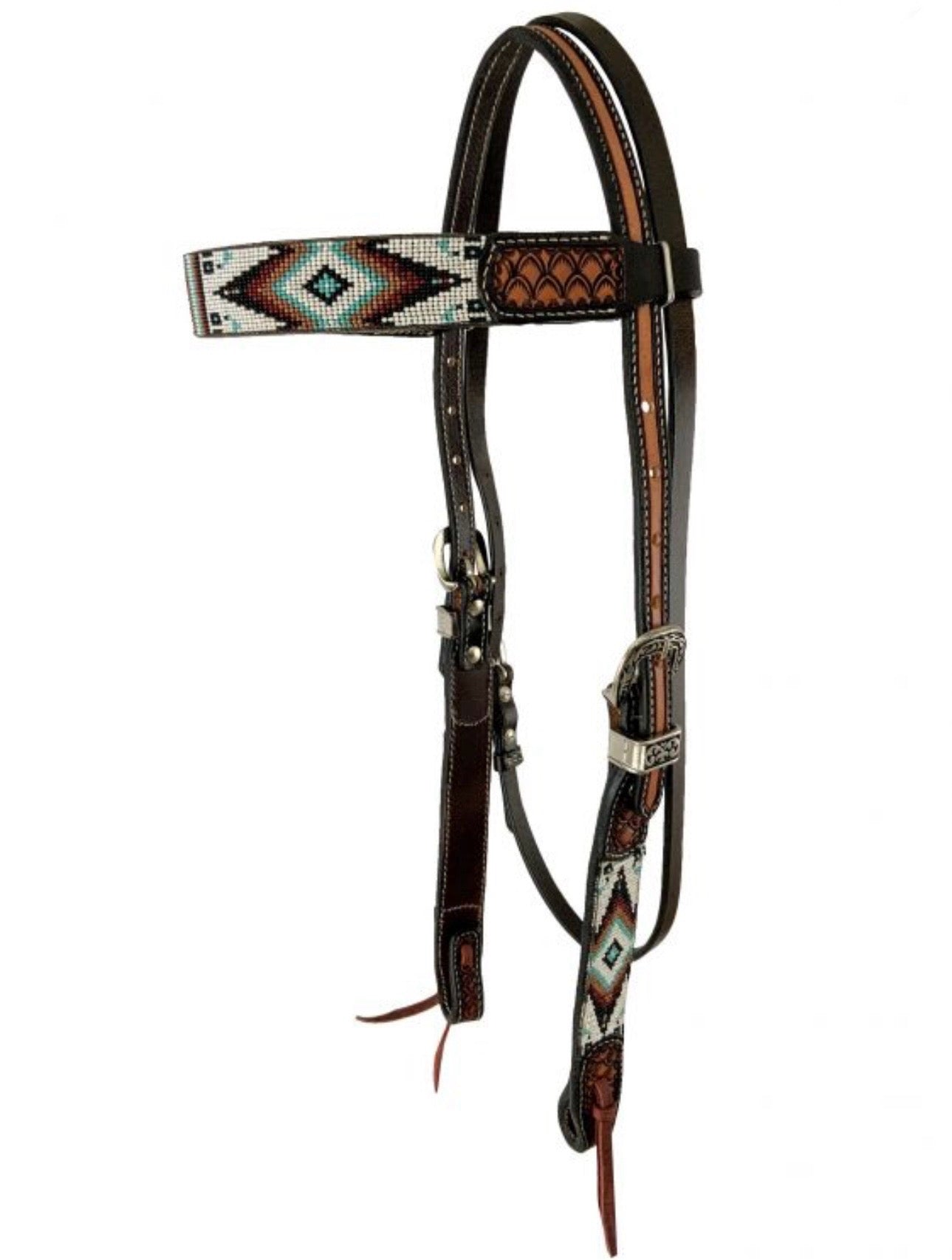 Crafted from two tone Argentina cow leather, this browband headstall features medium and dark leather with teal, brown, white, and black beading inlay on cheeks and browband. Accented with hand stamped scallop detail on cheeks and browband with white stitched edges. Adjustable at cheeks and throatlatch with antiqued silver buckles with black inlay. Complete with tie bit ends and stainless-steel hardware.