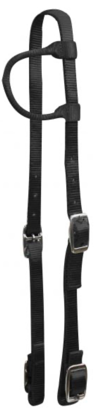 Premium Nylon One Ear Headstall. This headstall is made of soft and durable premium 2 ply nylon material. Easily adjusts on both cheeks with nickel plated buckles and easy change bit loops. Will adjust approx 15" to 19" (crown to cheek).