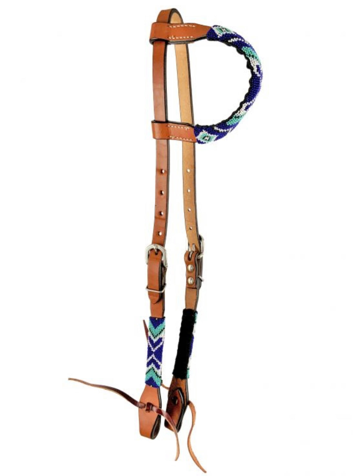 Arrow Beaded one ear headstall. This headstall features medium leather with a arrow beaded design overlay on cheeks and one ear piece. Beads are royal blue, turquoise, and white.