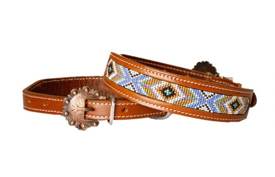 Genuine leather dog collar with beaded inlay. This 1" leather dog collar features a medium leather with periwinkle, mint, white, and gold beaded inlay design and copper hardware.