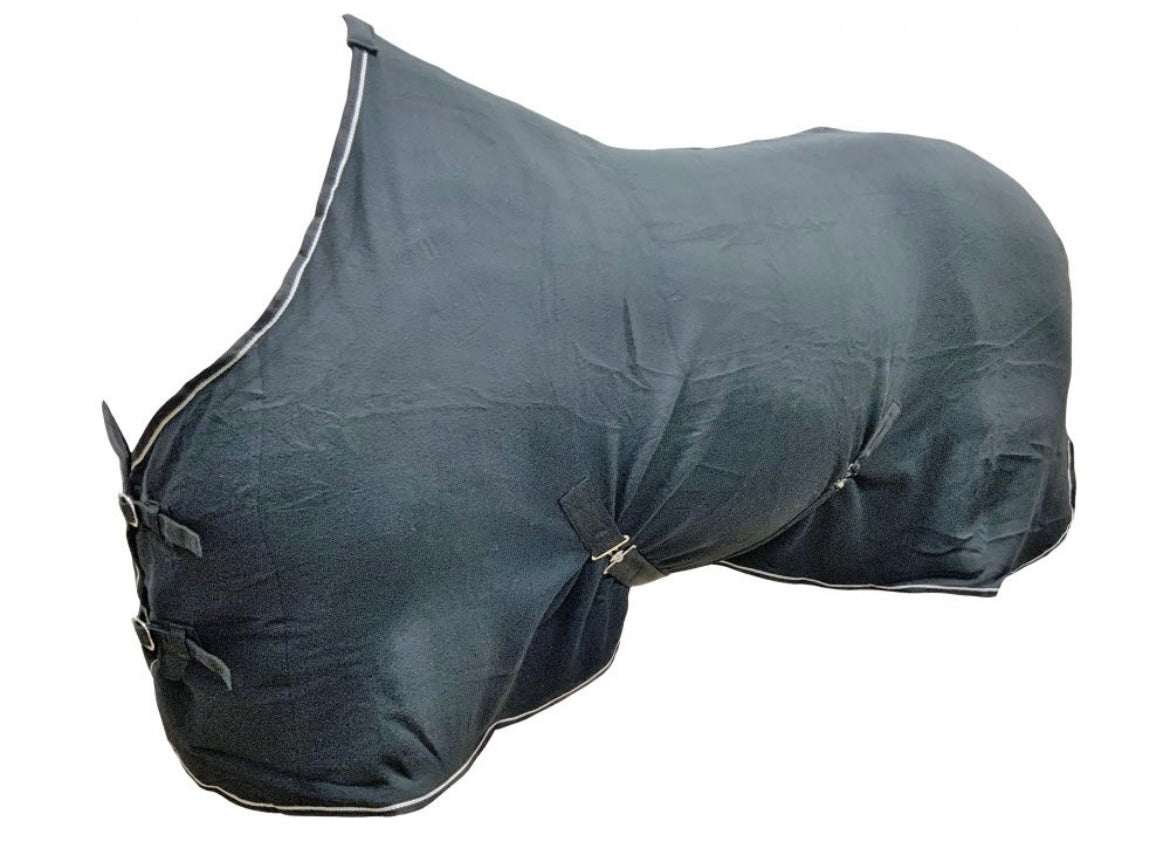 Contoured Black fleece horse cooler with double buckle front closure. This contoured cooler wicks away sweat & moisture after riding keeping your horse dry. This blanket has cross belly straps, string on tail closure and is contoured to give your horse the perfect fit. Can also be used under a regular blanket for extra warmth.