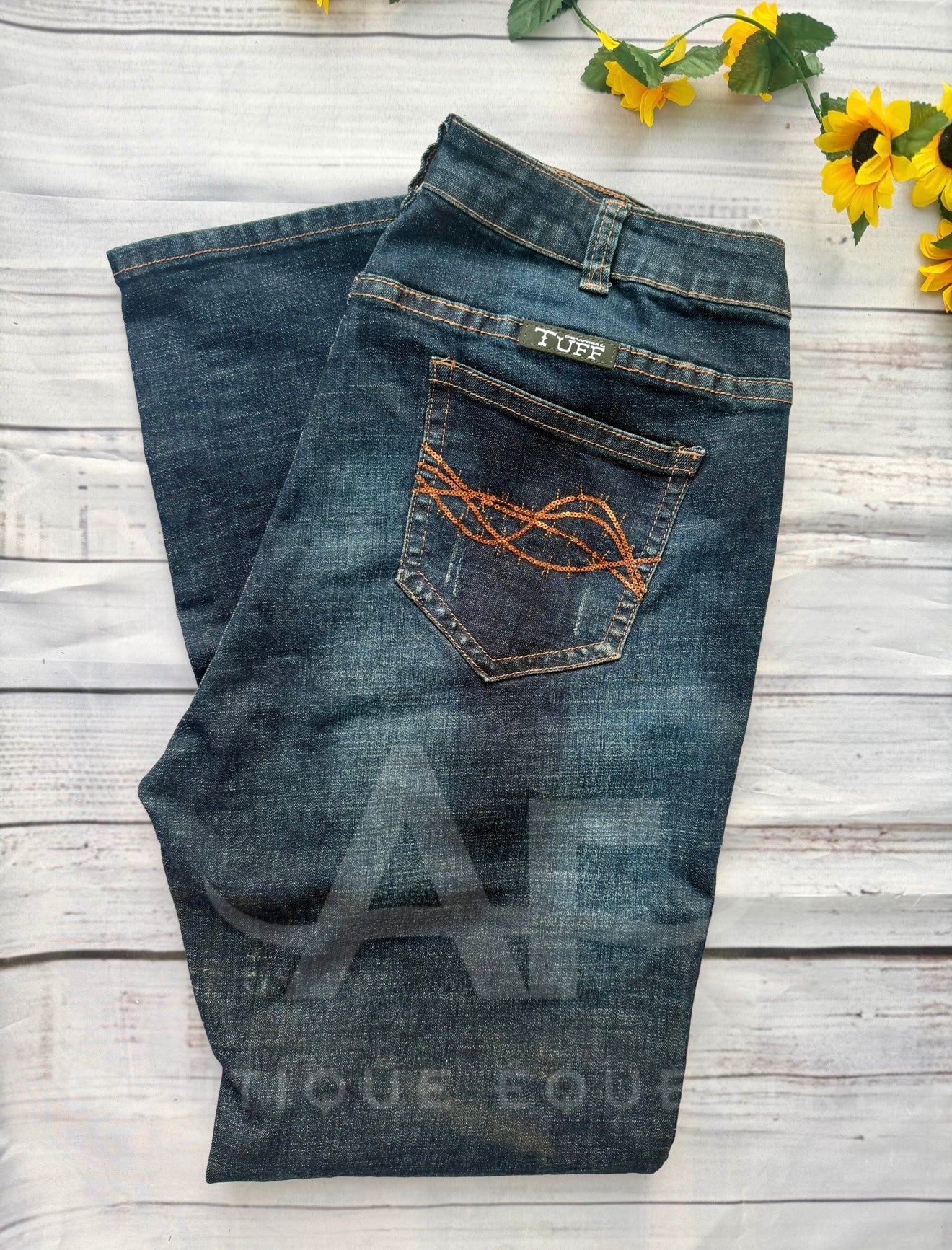 We all deserve a day off, and the perfect jean to go with it! Our TUFF FLEX® Bootcut Lazy Day II jean in a Dark wash with grinding accents is the perfect kick-back style. Finished with our standard 7 belt loop design, rose-color crystal embellishments atop stylish distressing details, and copper barbed-wire sequin detail on the back pockets.
