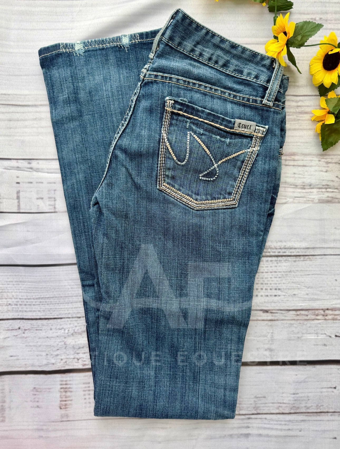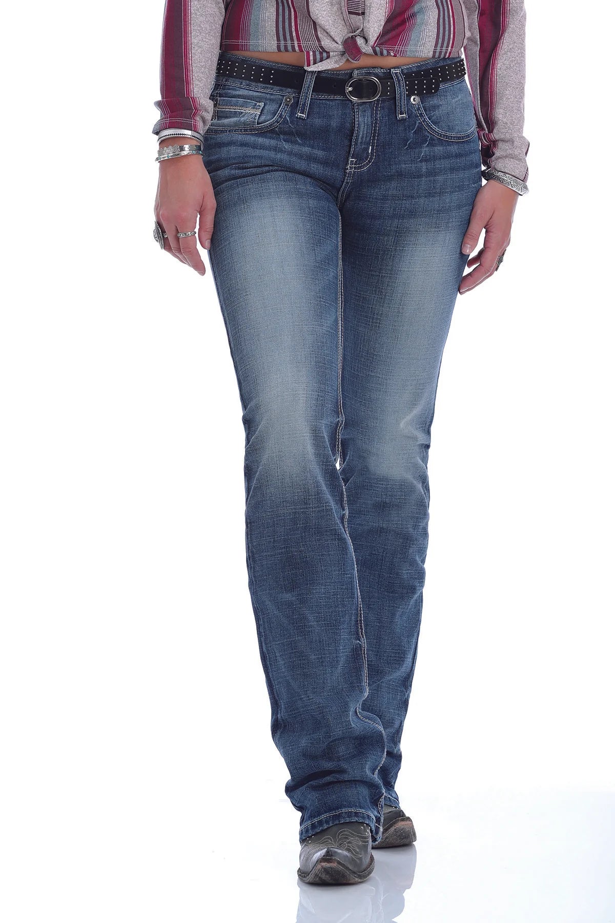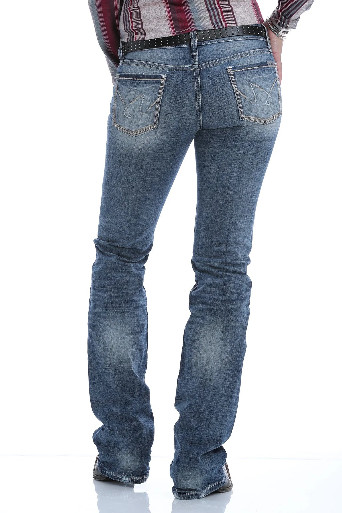 ABBY brings forth an ultra-finished look with heavy hand sanding, whiskers, chevrons, grinding and tacking. Topstitching in buff and gray enhance the medium stonewash finish, along with signature stitched back pockets in white.