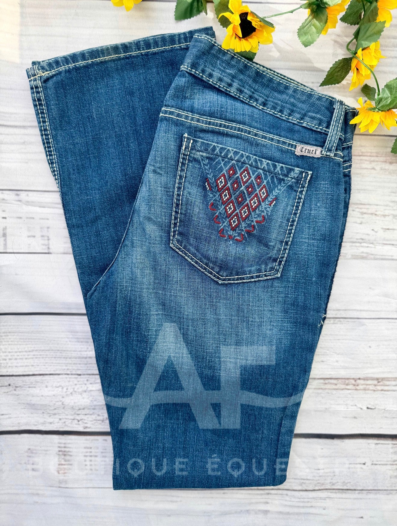 The ABBY jean is elevated with a discharge print and intricate embroidery creating the appearance of sophisticated beading on the back pockets. The versatile medium stonewash, hand sanding, whiskers, chevrons and 10.9 oz. crosshatch stretch denim make this jean one-of-a-kind. medium stonewash, hand sanding, whiskers, chevrons, 10.9 oz stretch denim