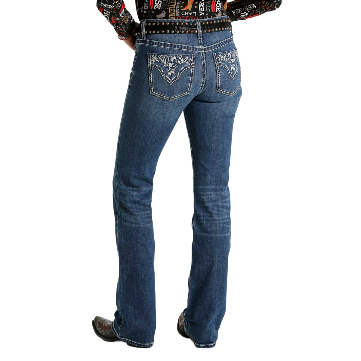 - Back pockets with western yokes, floral and whipstitch embroidery.