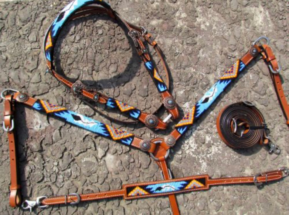 Beaded Aztec 4 Piece Headstall and Breastcollar Set. This set features medium leather with a bright aztec beaded overlay with oranges, black, turquoise, and yellow beads. Set is accented with antique bronze and turquoise stone conchos and buckles. Set comes with browband headstall, breastcollar, wither strap, and contest reins.