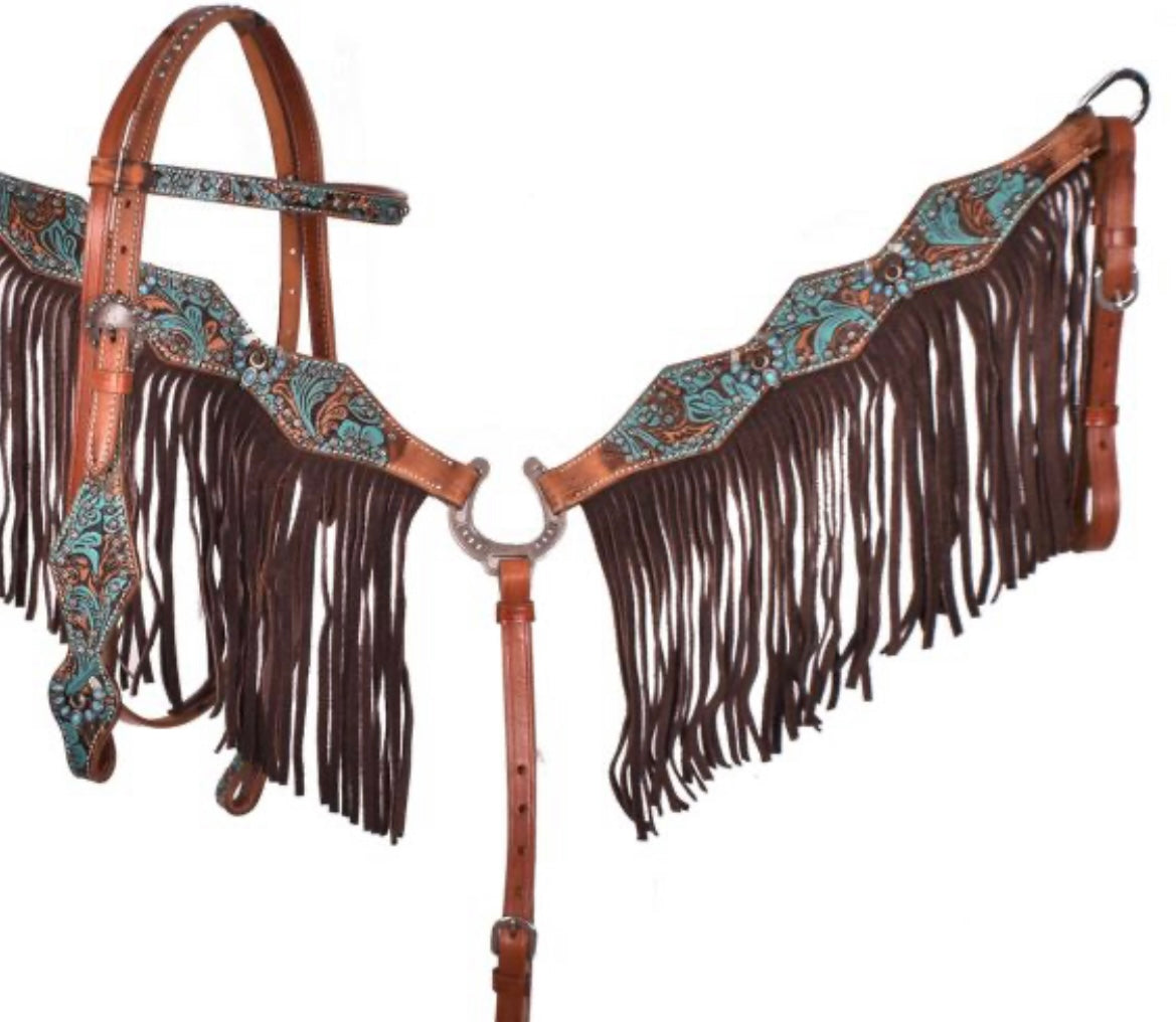 Turquoise and Brown Floral Tooled browband headstall and breast collar set. This set features medium double stitched leather accented with a turquoise and brown hand painted floral tooled design and accented with turquoise stone horseshoe conchos and engraved silver studs. Breast collar is accented with chocolate brown suede leather fringe and horseshoe center chest plate. Headstall comes with 5/8" x 7' leather split reins.