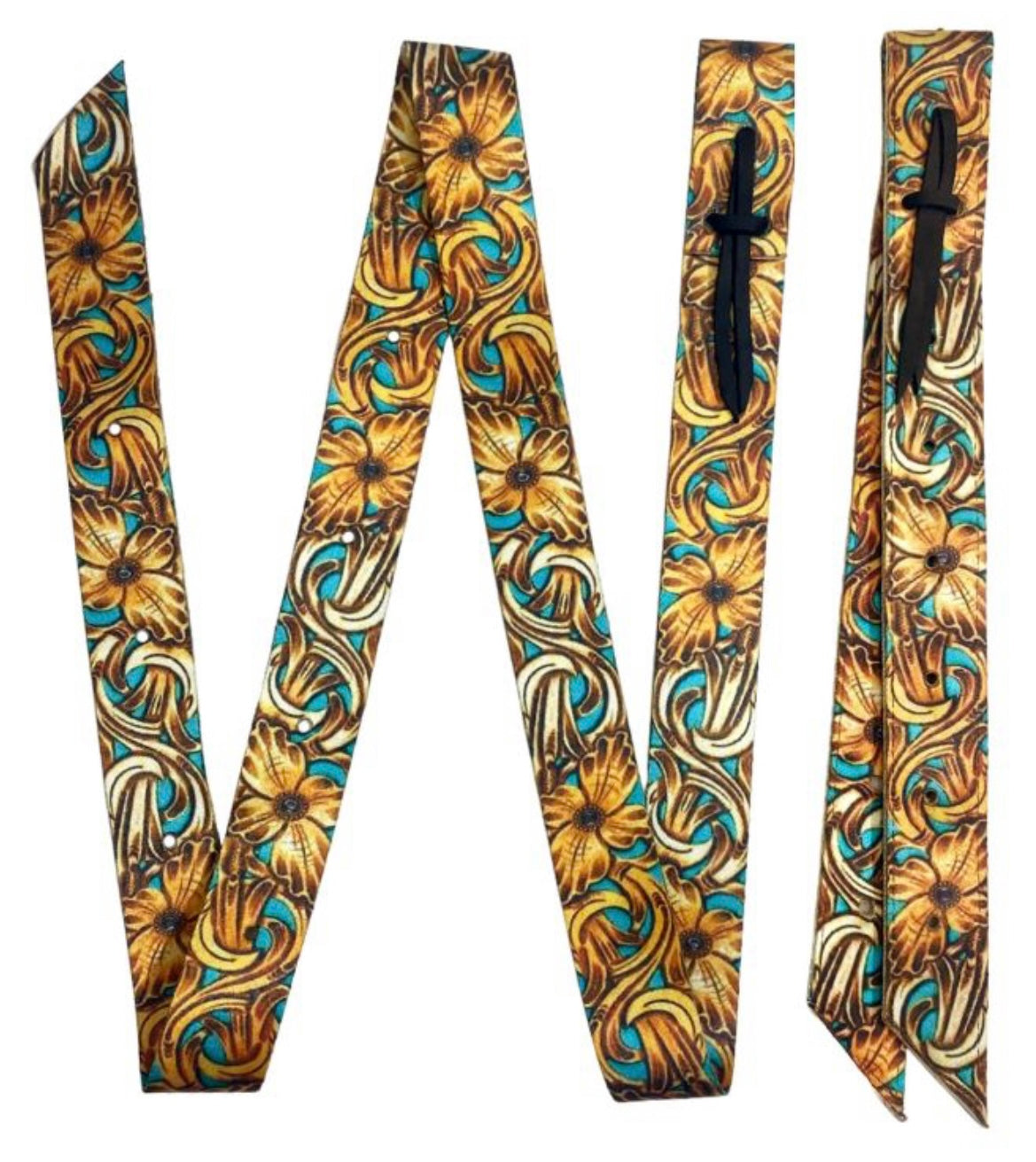 If you're looking for a high-quality and stylish tie strap and off billet set for your horse, look no further than this premium quality nylon floral print set. This yellow and brown filigree floral design set features a teal background printed on high quality nylon. Made from durable and strong nylon material, this set is designed to provide reliable performance and long-lasting use.