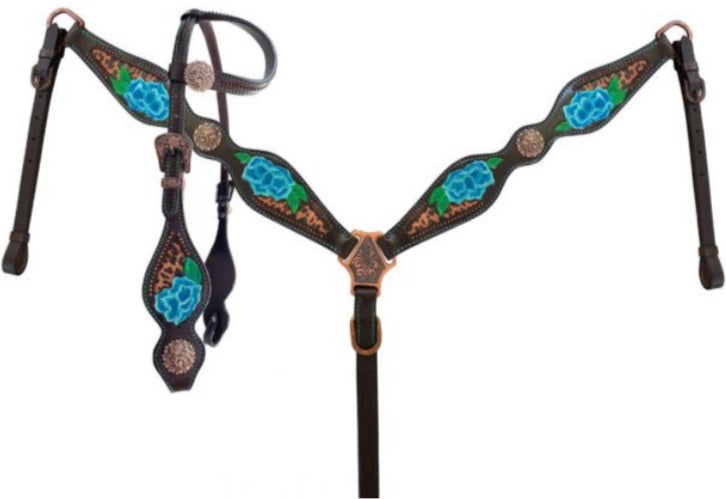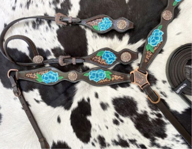 Cheetah print inlay with painted blue flower accent one ear headstall and breast collar set. This set features dark leather with a cheetah print inlay. Set is accented with a painted blue flower accent with copper Conchos and hardware. Headstall comes with 5/8" x 7' leather split reins.