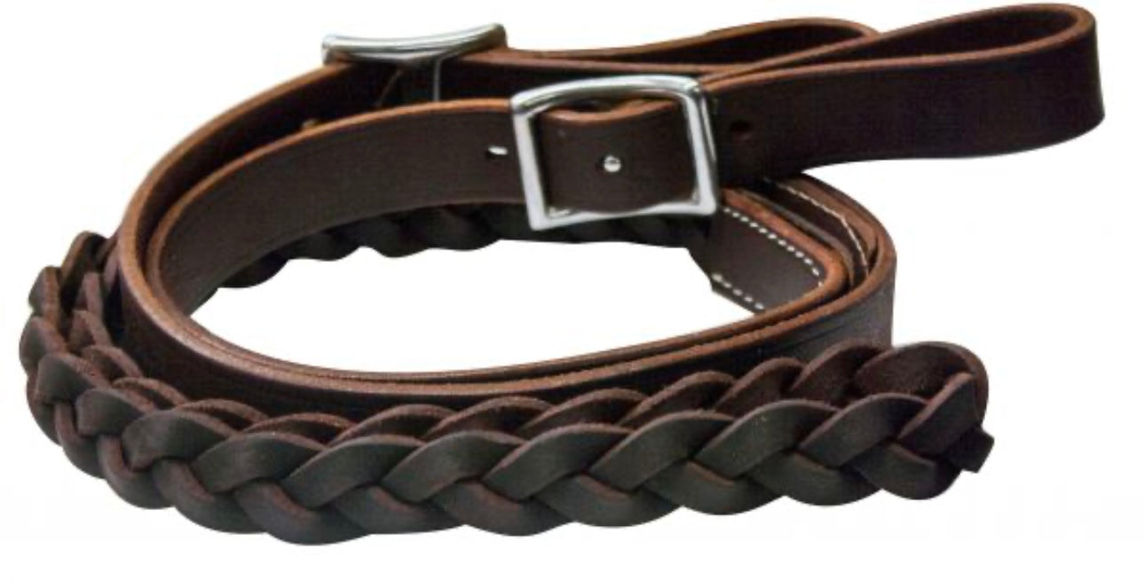 One piece leather braided middle roping rein with buckles. Reins measure 1" wide X 6 1/2" long.