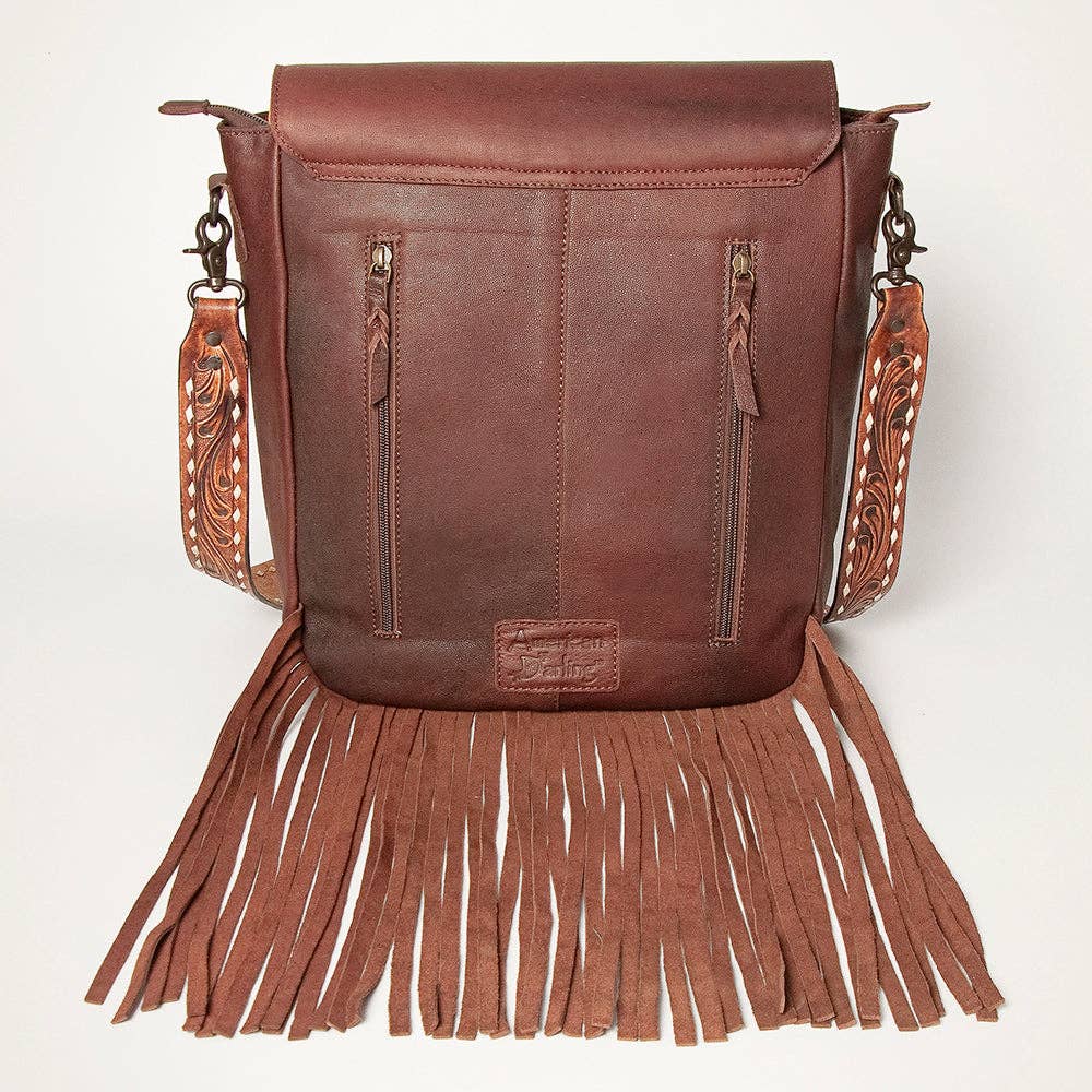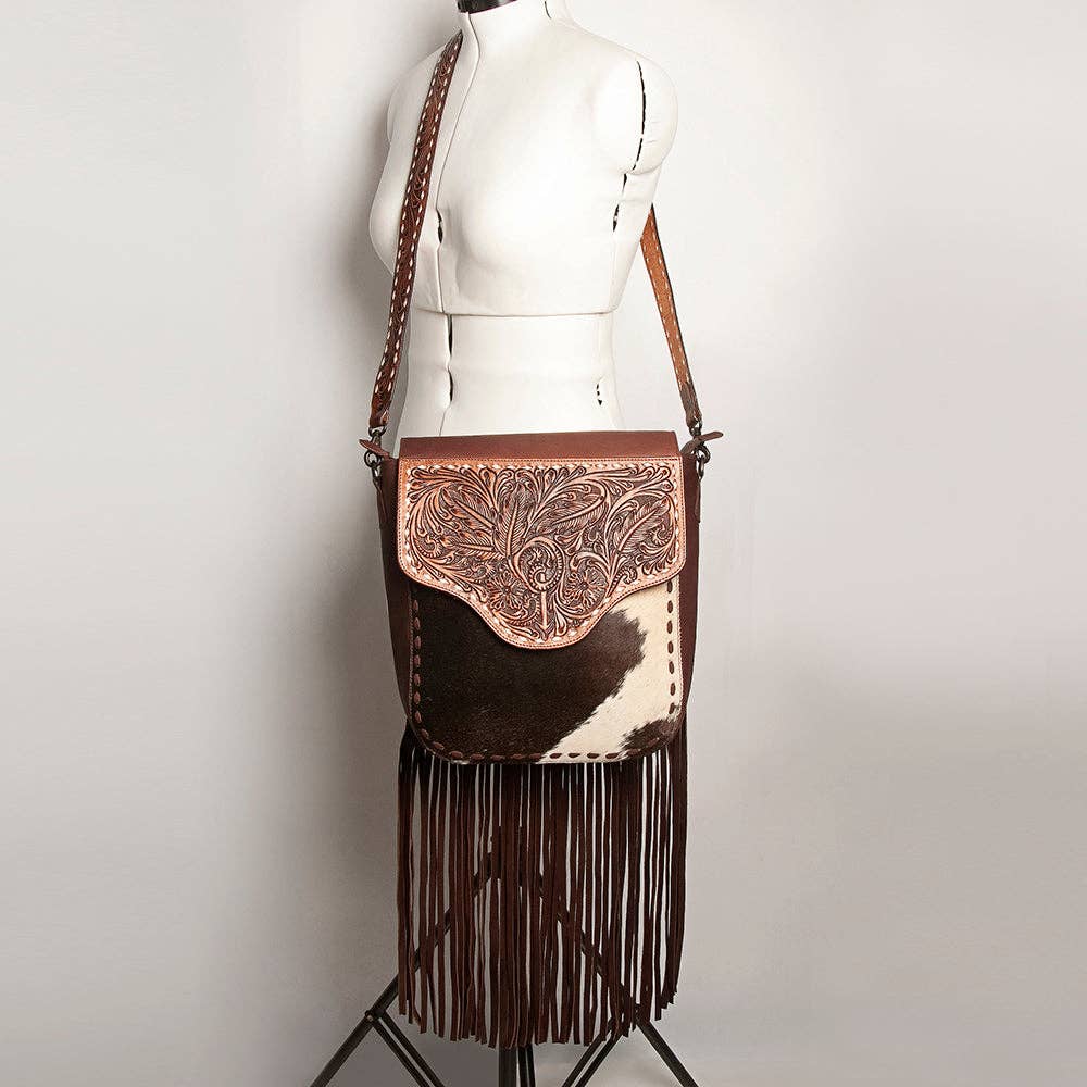 American Darling is a proud Official Designer Sponsors of New York Fashion Week 2024. Detailed Hand tooled, carved and finally antique hand finished vegetable tanned American Cowhide Leather, exquisitely done by the finest artists and craftsmen in the country. High quality Genuine Full Grain Leather. Soft and supple leather that ages beautifully as it wears. The handpicked cowhide hair-on genuine leather not only adds a soft and tactile element but also serves as an embellishment, enhancing its overall western appearance. Decorated with beautiful leather fringes giving it a western look. The shoulder strap is adjustable and made of 100% genuine vegetable tanned Cowhide Leather with a hand tooled pattern. Genuine YKK brand known for long lasting and durable zipper closures ensure security of your essentials. Size/Dimensions: 13.5in (H) X 16in (W) X 4in (D) A luxurious and western handcrafted leather collection designed by American Darling here in the heart of Texas. These gorgeous creations deliver a blend o
