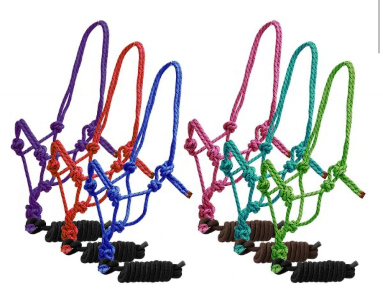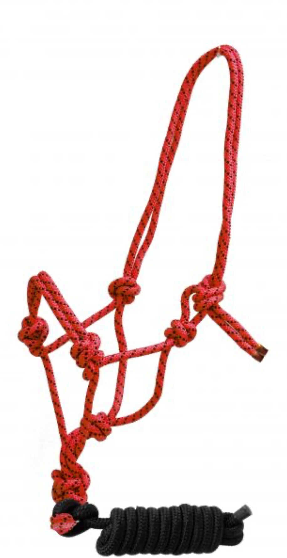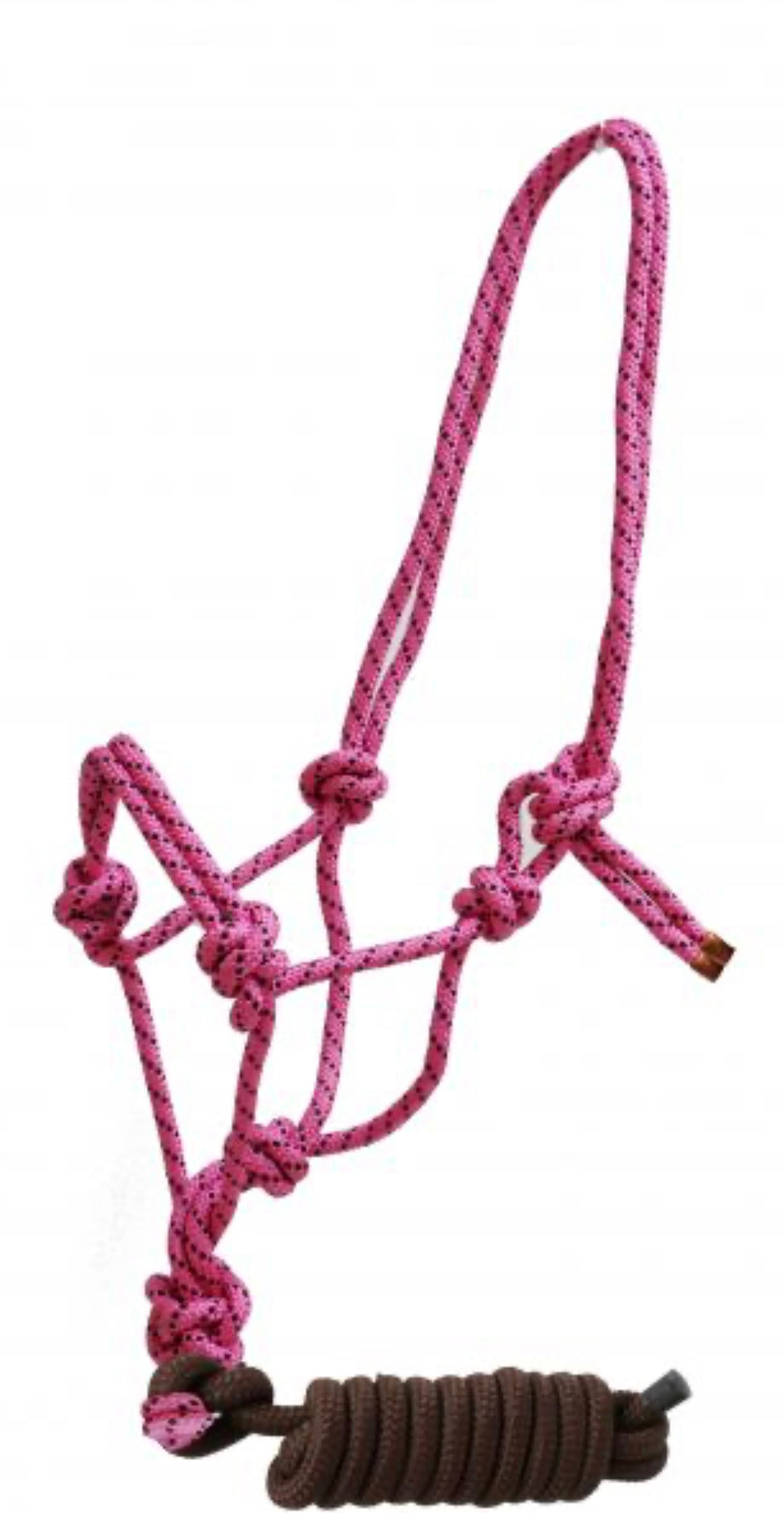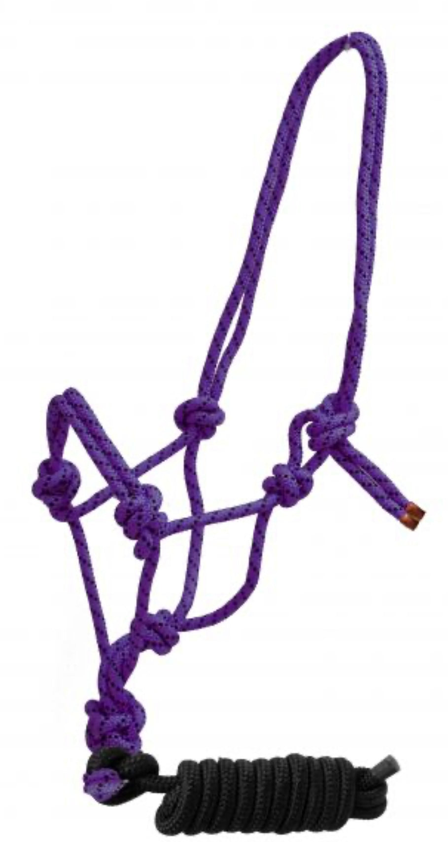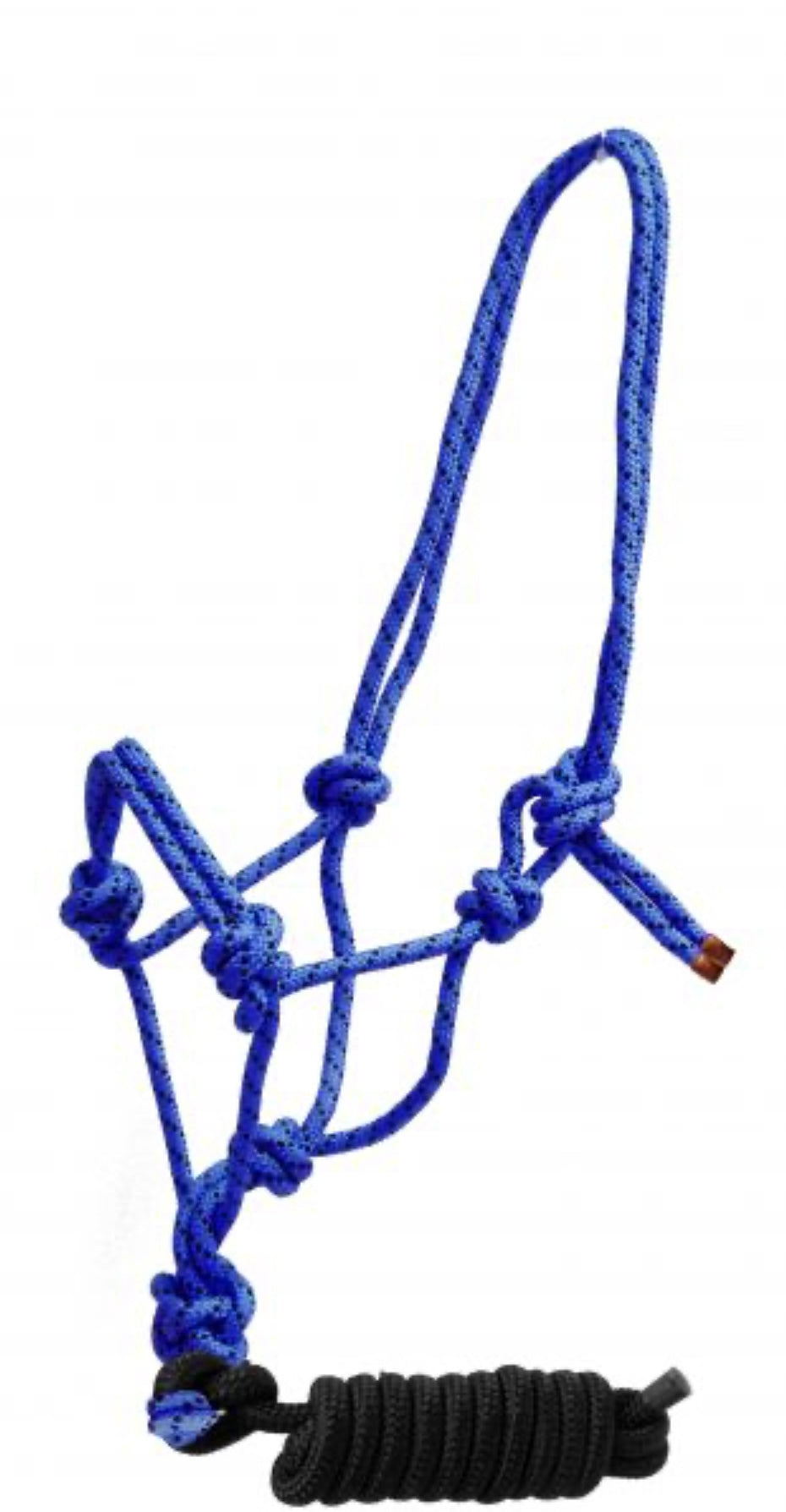 Horse size braided nylon cowboy knot rope halter with removable 7.5 ft lead. This cowboy knot halter features colored round braided nylon accented with black nylon spots. 7.5 ft removable lead with rubber end.