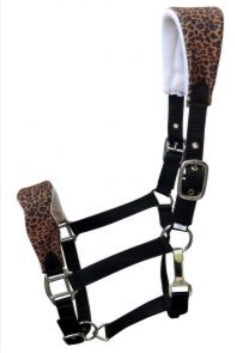 Adjustable black nylon bronc halter with a padded cheetah noseband & crown. This bronc halter features a fleece padded crown and nose for extra comfort. Black nylon halter with silver hardware and eyelets.