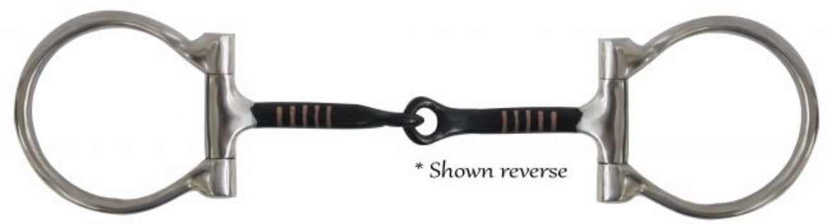Stainless steel D-ring 5" sweet iron mouth bit with copper inlays. This bit features 3" stainless steel swivel D rings and sweet iron snaffle mouth with copper inlays.