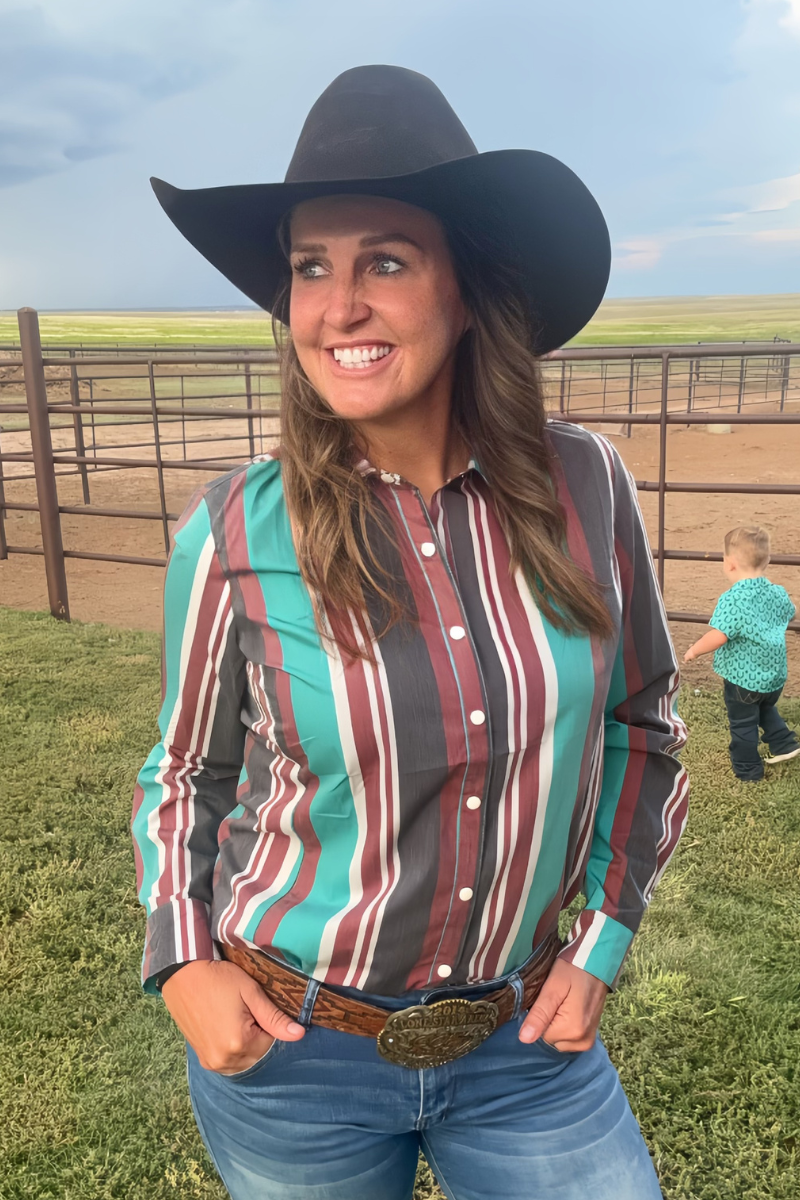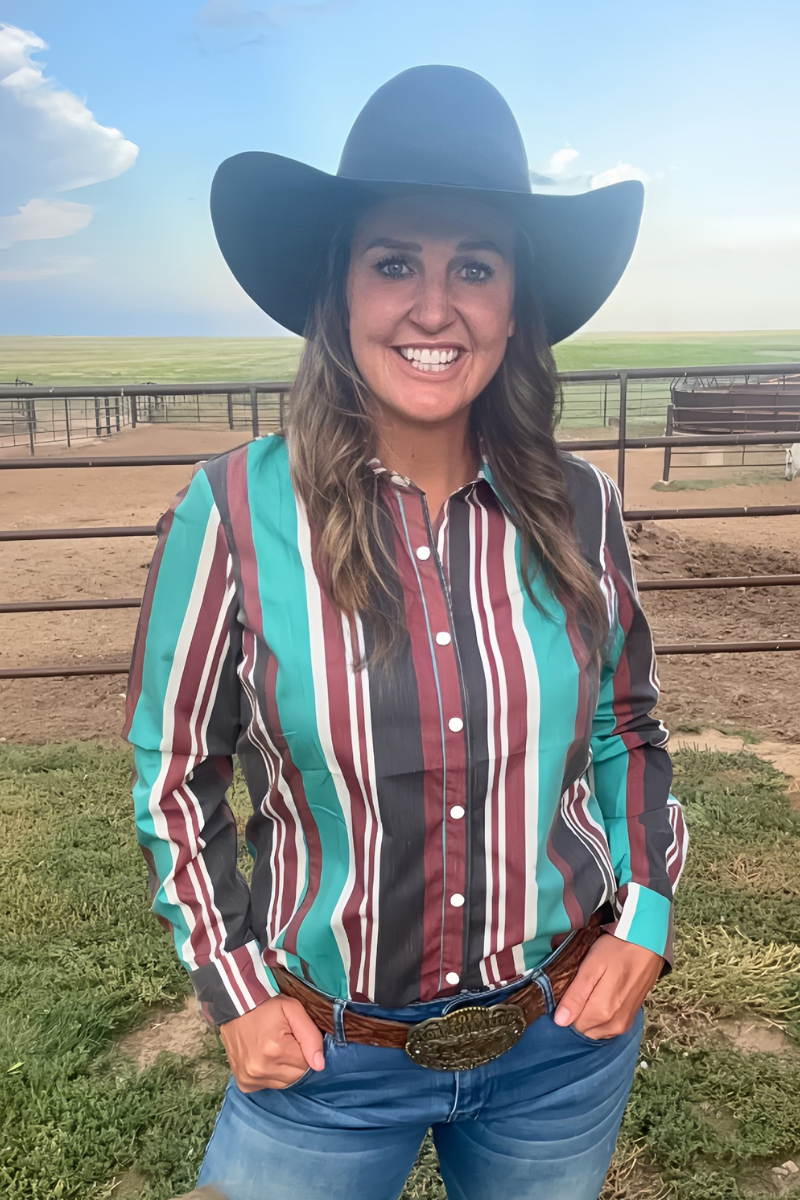 Ajoutez une touche de style vintage à votre look avec le bouton haut Oh My Darling. Avec des boutons-pression classiques en perle de rodéo et des rayures rouges, noires et turquoises audacieuses, cette chemise allie charme ludique et style intemporel. Parfait pour se démarquer. 95% Polyester 5% spandex