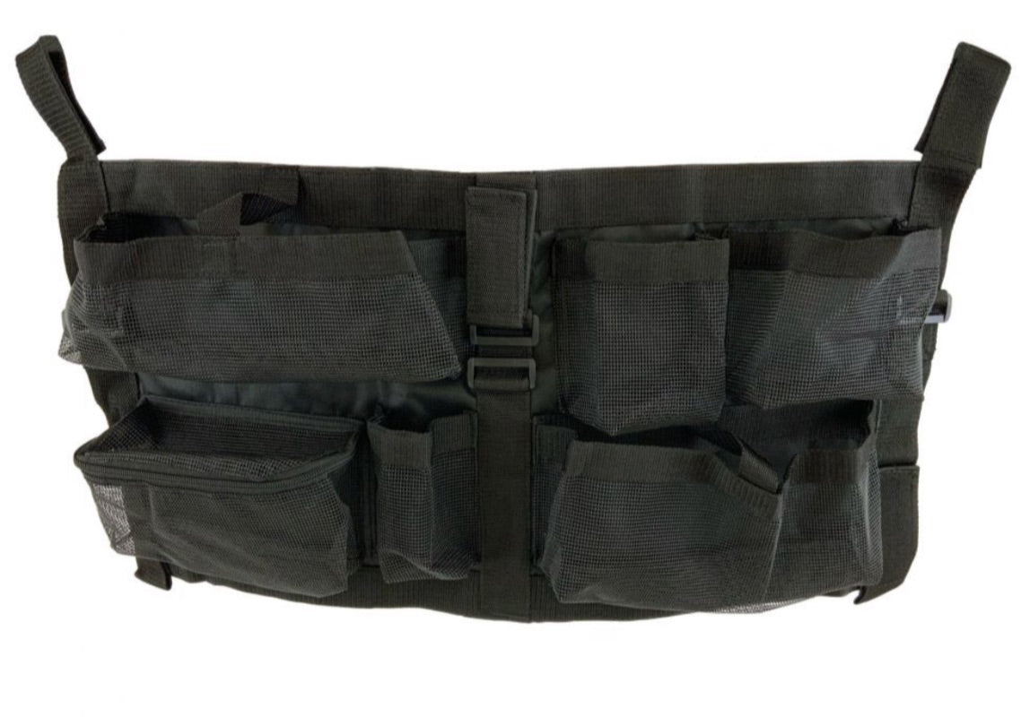 Nylon Barn or Trailer Door Grooming Organizer. This grooming tote is made of durable nylon and has multiple pockets that fit most size brushes and is perfect for hanging over a barn door or trailer door. It has nylon rubber mesh pockets designed so that your items stay in place. Designed with quick grip closure for added strength with one in the middle to ensure it doe snot sag. Great for shows, the barn or events.