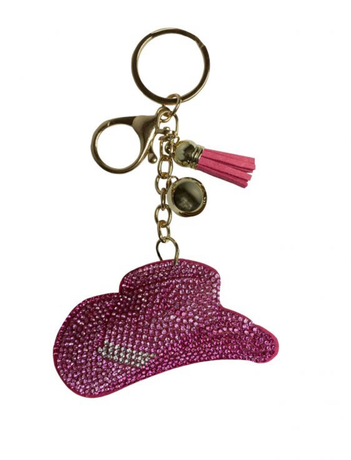 This beautifully bedazzled pink cowboy hat measures 3" in length and is full of sparkling rhinestones! It features gold tone metal, decorative tassel and gold ball, large ring for your keys and a purse clip. The back of the keychain features a soft plush velvet fabric that is durable and long lasting. This sparkly keychain can be used for keeping your keys safe or as a colorful fashion accessory. A great gift item for any woman or girl! Perfect for handbags, luggage, purses, computer bags, backpacks and more!