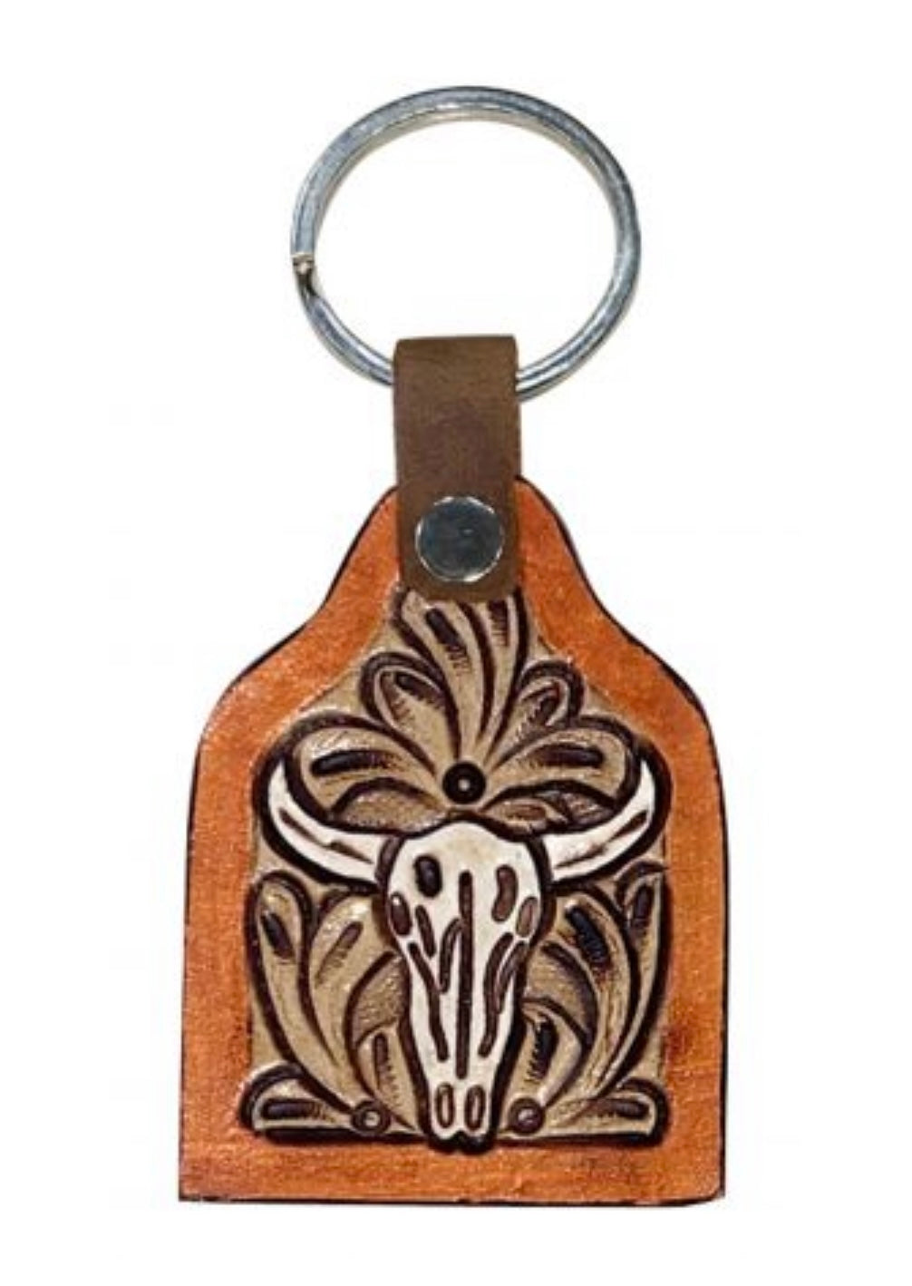 Cow tag shaped White painted tooled leather cow skull keychain