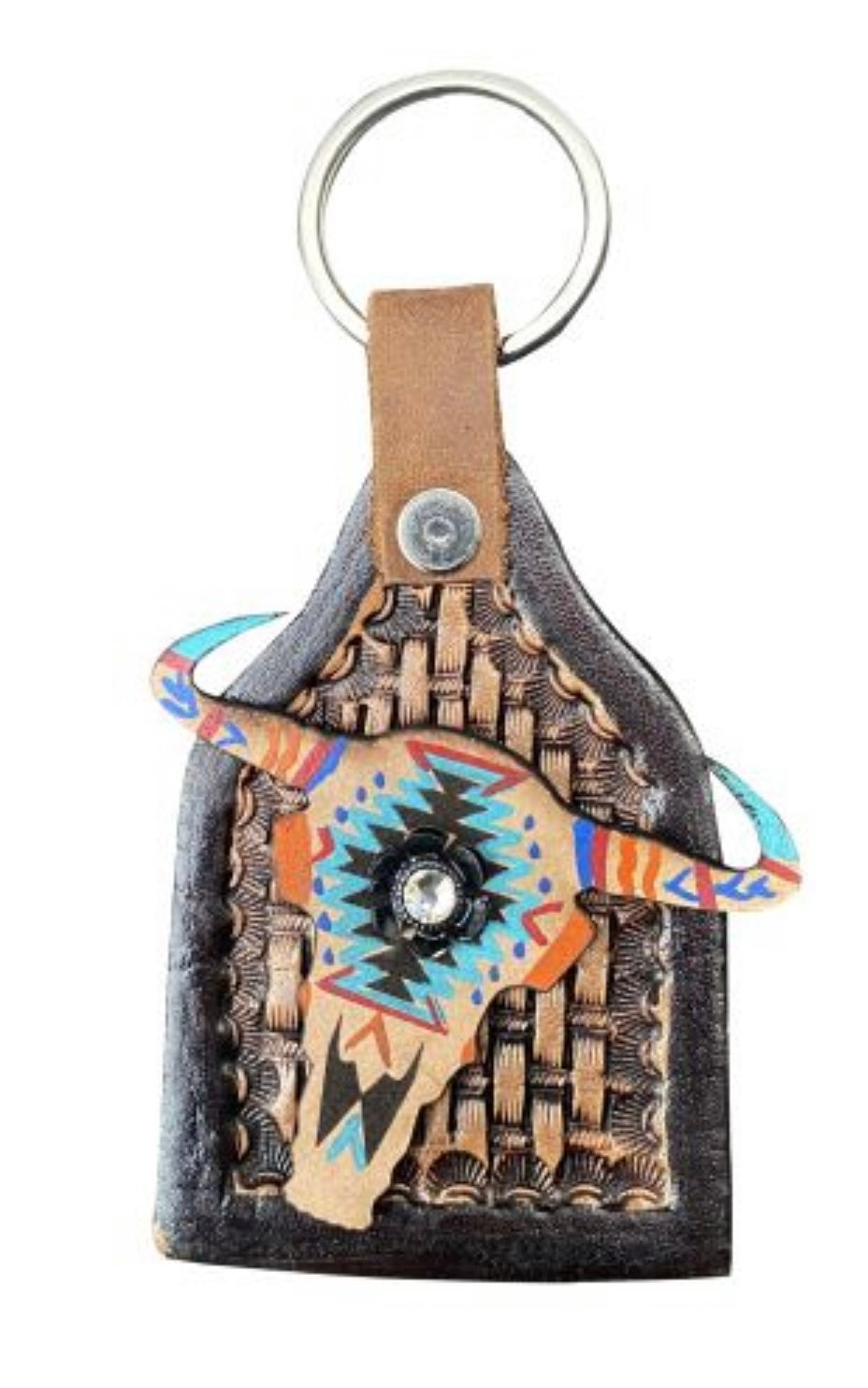 Cow tag shaped Aztec cow skull keychain