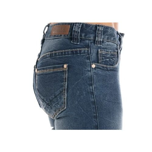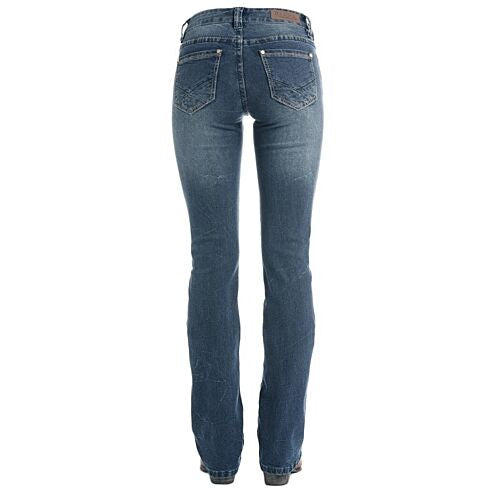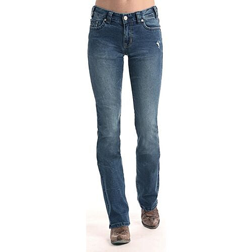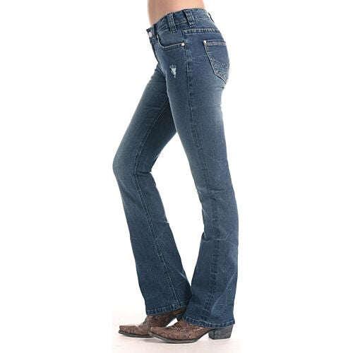 Ladies Mid Rise bootcut extra stretch in medium Vintage with crisscross flat seams on both back pockets and matching coin pocket. Khaki and navy top-stitching with antique rose hardware. New "Rock and Roll" brown leather waistband label and zip fly.