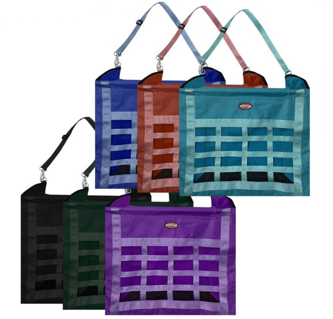 Slow feed hay bag with 16 feeder holes. Durable heavy duty nylon that is easy to fill and carry. Adjustable nylon strap with clasp. Large capacity opening with covered bars that add stability. Velcro closure and flip over velcro flap to keep hay secure. Mesh bottom allows dust to fall through while keeping the hay in the bag.