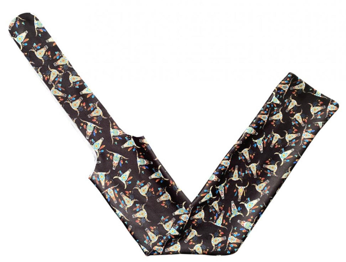 Cow skull/sunflower printed slip on tail bag. This tail bag is made of stretchy Lycra® material and is designed to protect hair from dirt and breakage. Measures 22" with 11" ties.