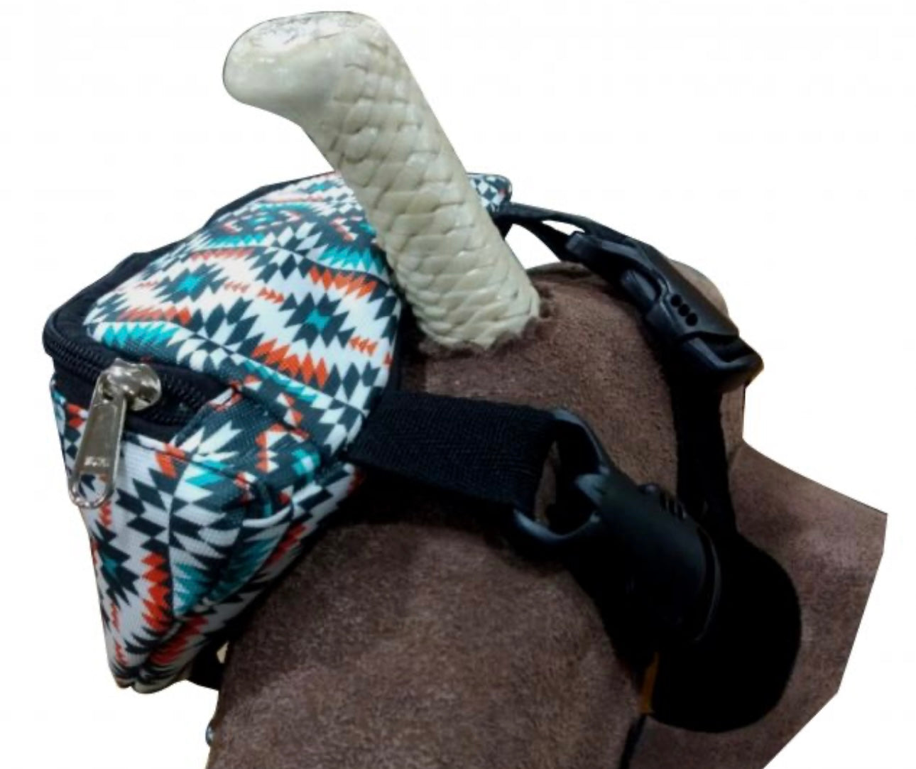 Aztec Print Insulated Nylon Saddle Pouch. Includes two convenient pockets that are ideal for your phone, keys, money, snacks, etc. Simply clip the saddle pouch to the pommel of your saddle with two buckles. Measures 8.5" long by 3.5" wide by 4.5" tall