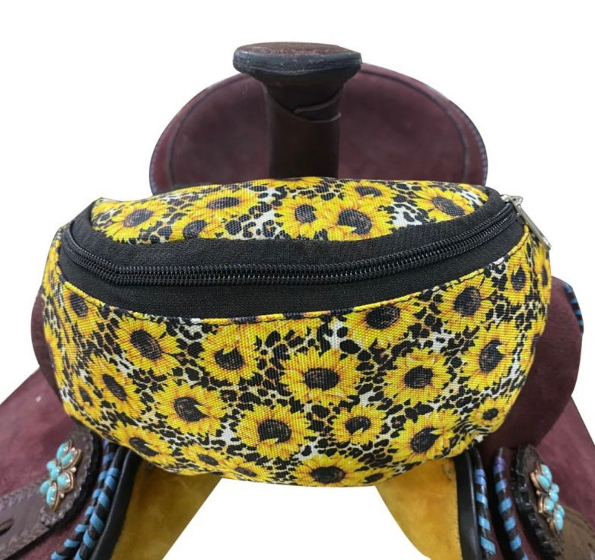Sunflower & Cheetah Print Insulated Nylon Saddle Pouch. Includes two convenient pockets that are ideal for your phone, keys, money, snacks, etc. Simply clip the saddle pouch to the pommel of your saddle with two buckles. Measures 8.5" long by 3.5" wide by 4.5" tall