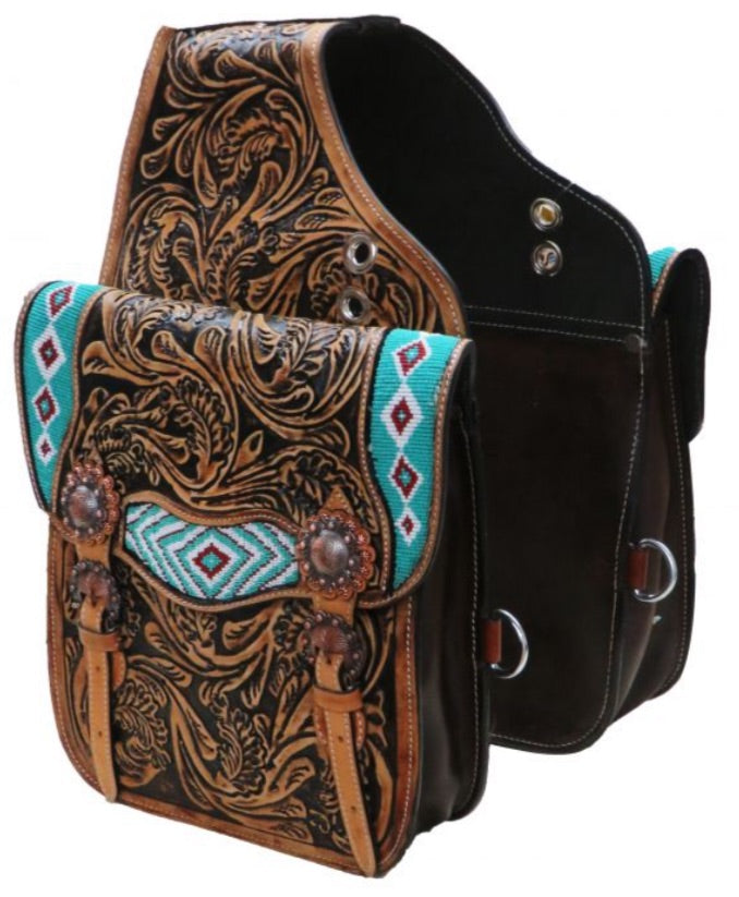 Tooled leather saddle bag with beaded inlay. Comes equipped with front D rings. Bags measures 10" x 10" x 3".