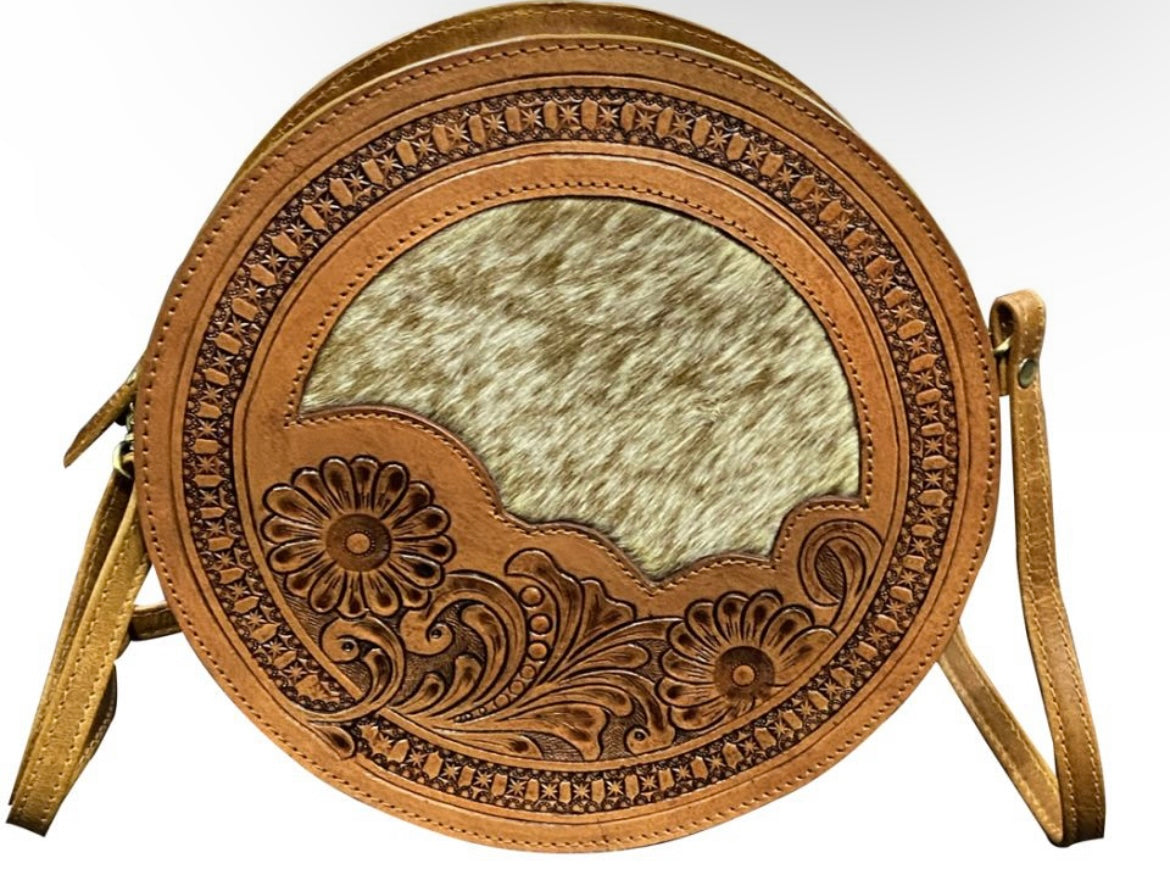 Klassy Cowgirl Medium Leather round Crossbody Bag with cowhide inlay. This round style handbag features a multi color cowhide inlay, adjustable/removable strap and zipper pockets on the inside and outside. Measures Approx. 10" H x 9" W.