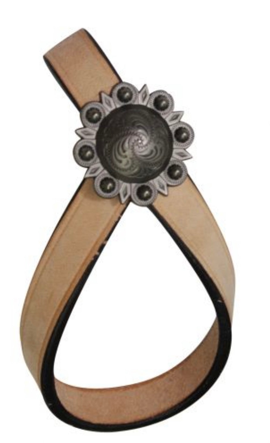 Leather Tie down Keeper. This leather tie down keeper features 3/4" leather accented with an engraved silver concho. Keeper measures 4" long.