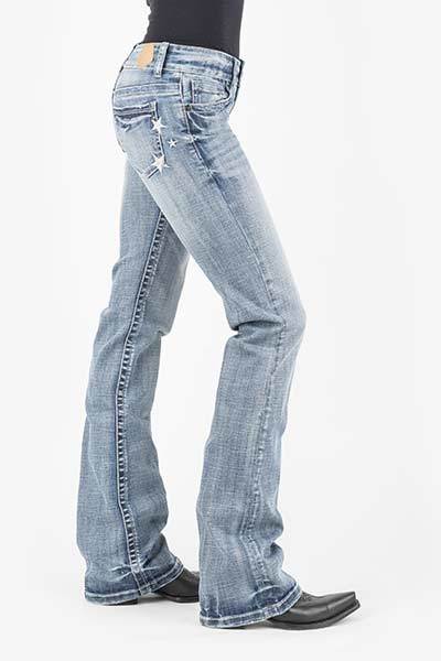 Womens Tin Haul Jeans: Ladies Tin Haul Western Denim. Hey cowgirl, looking good! These women's low rise Rosie jeans sit low on the waist and have an easy fit through the thigh with a bootcut leg opening. Jeans have a button and zip front with contrast top stitching and mild whisker details. 98% Cotton, 2% Spandex