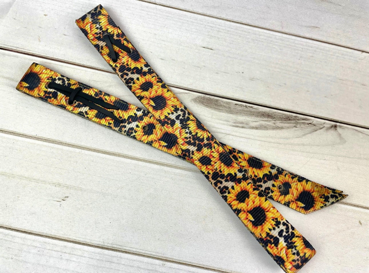 Premium Quality Sunflower/ Cheetah Print Nylon tie strap and Off Billet set . 2ply webbed nylon. Off billet has 6 pre-punched holes and measures 18" x 1.75". Tie strap measures 6' x 1.75".